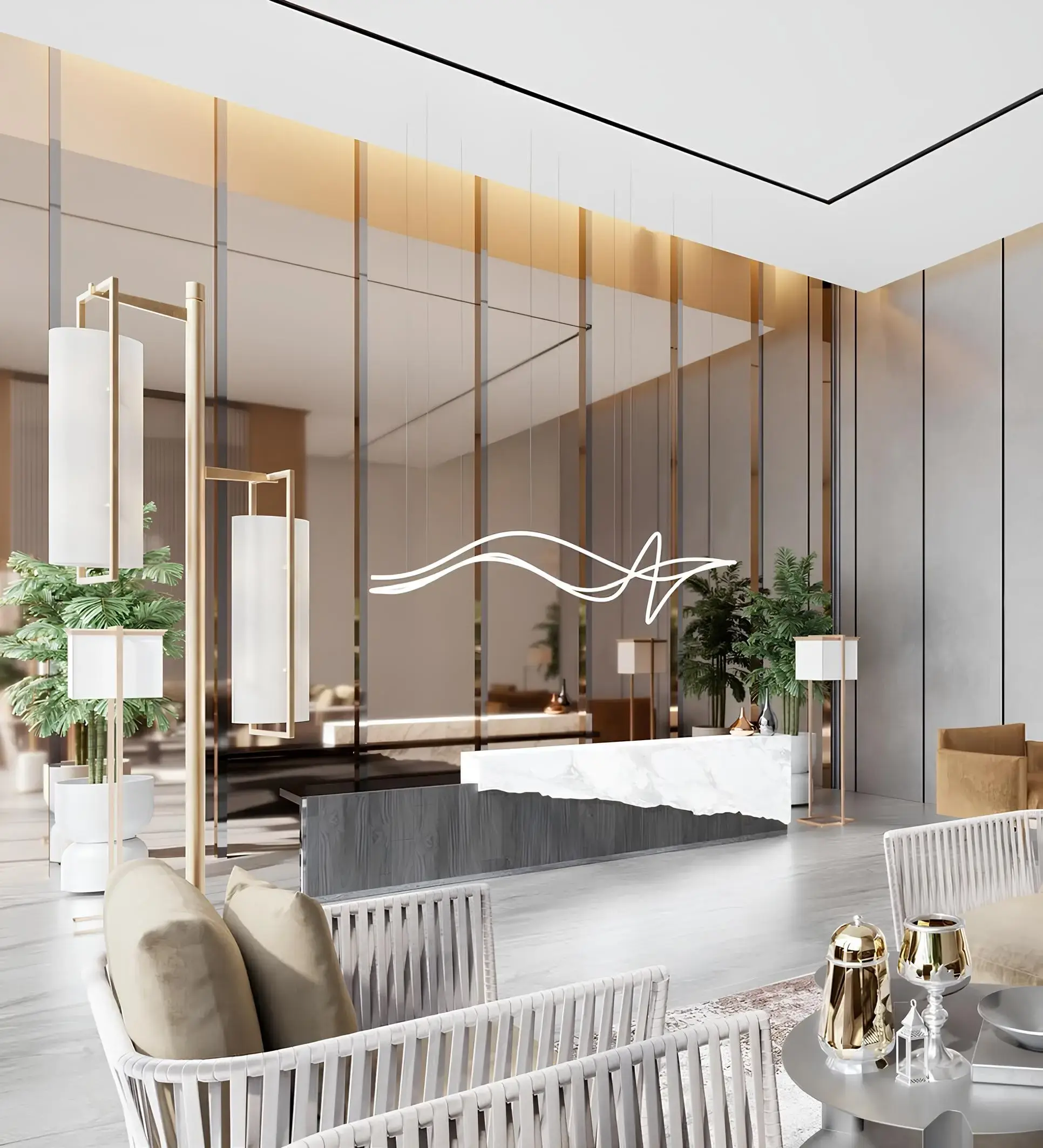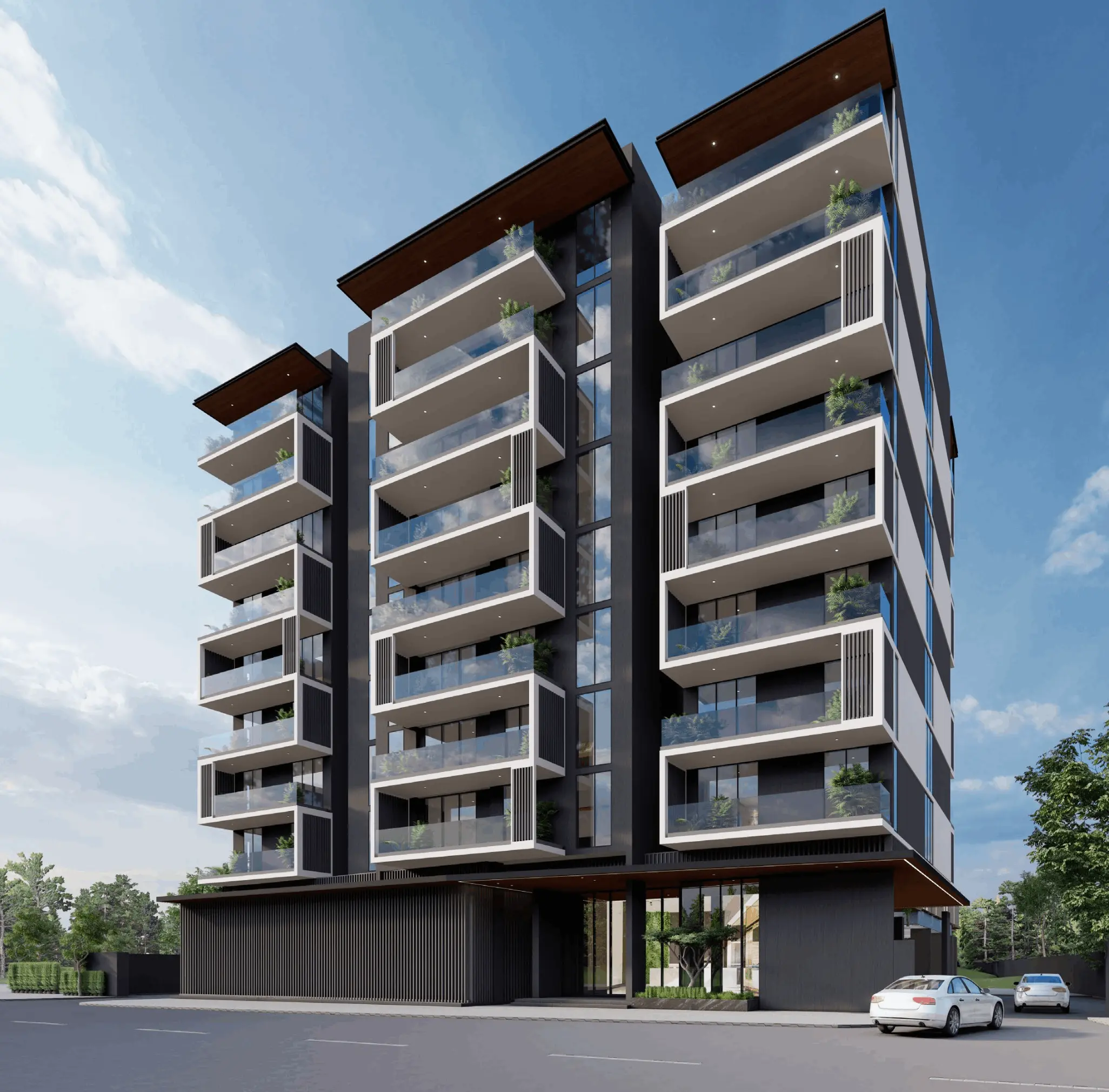 The building’s architecture features clean geometric lines, panoramic glazing, and neat balconies, creating an elegant and calm visual appearance. The entrance area is designed as a spacious lobby with a waiting zone, offering a sense of comfort and privacy.