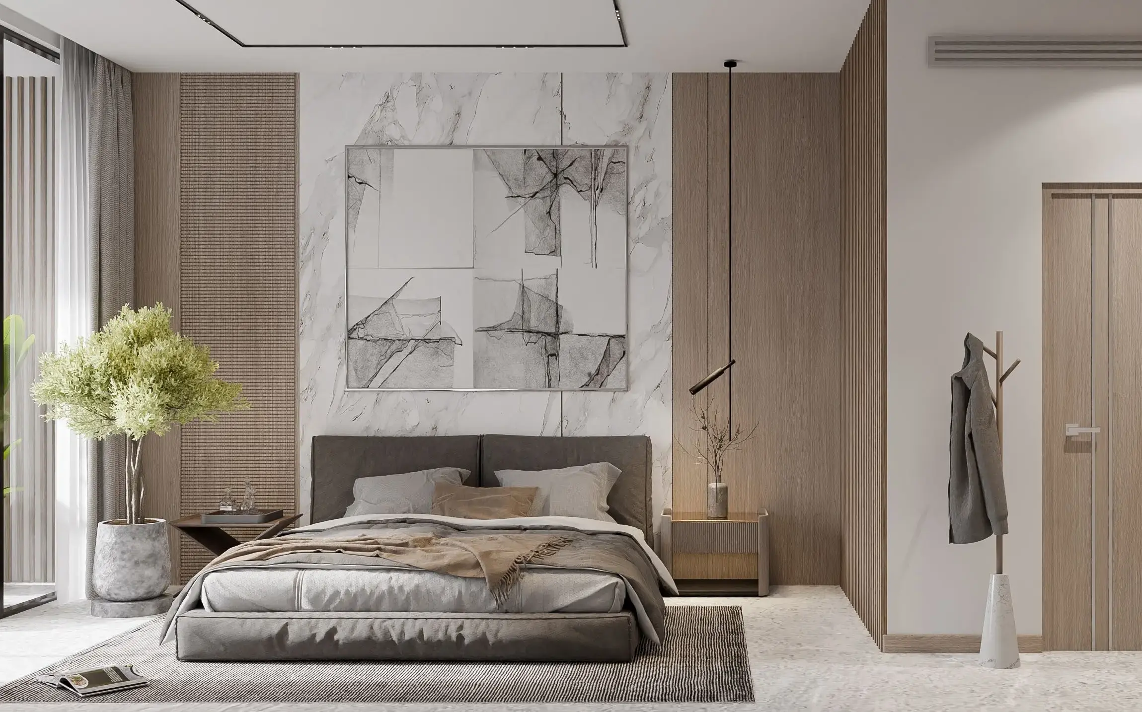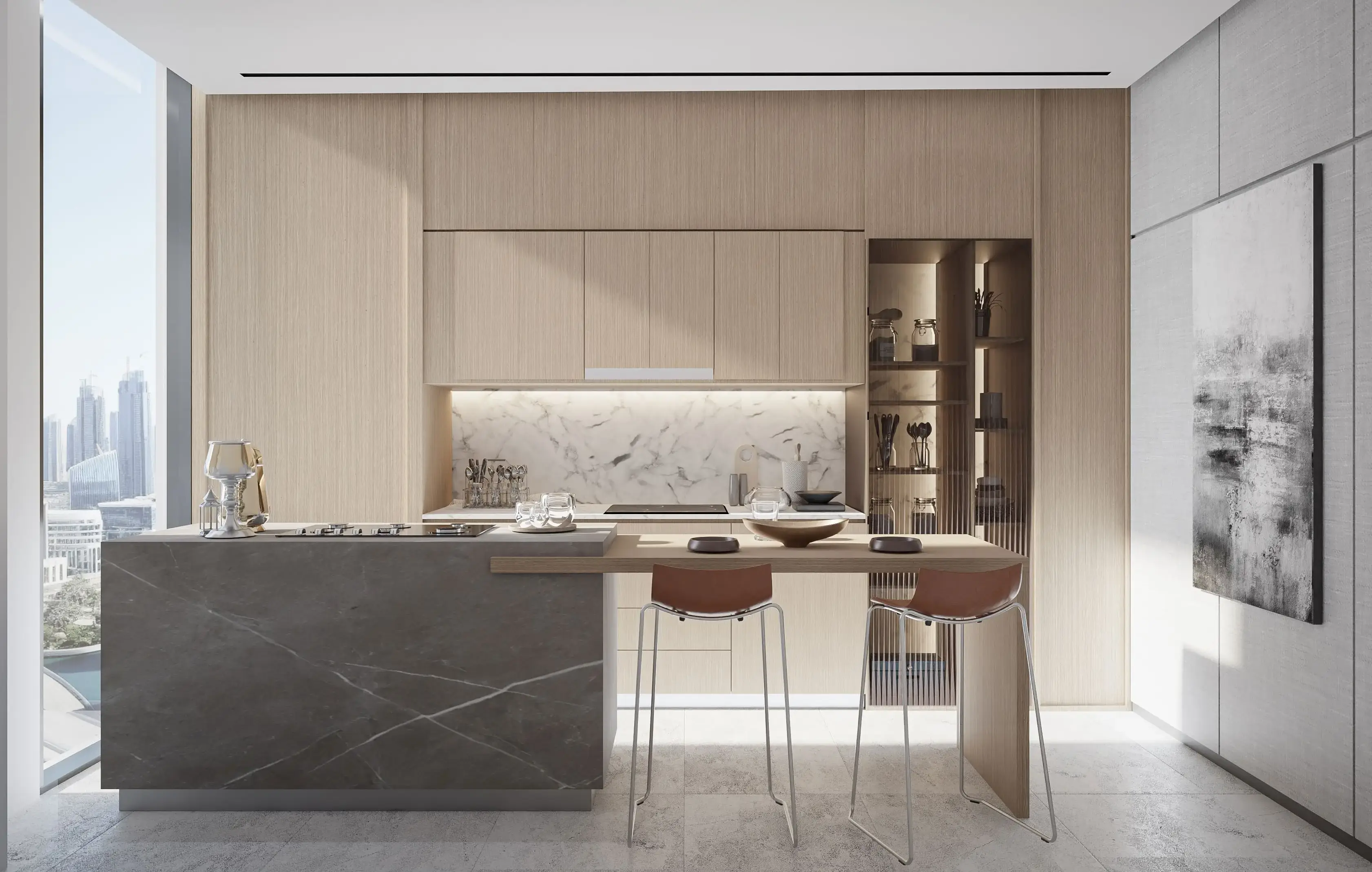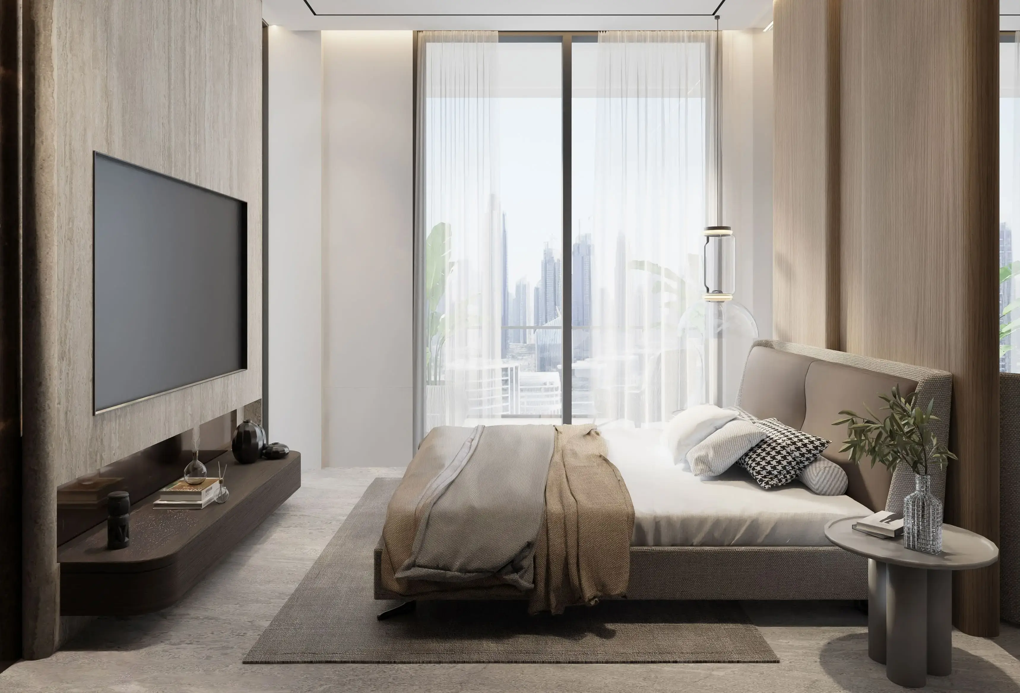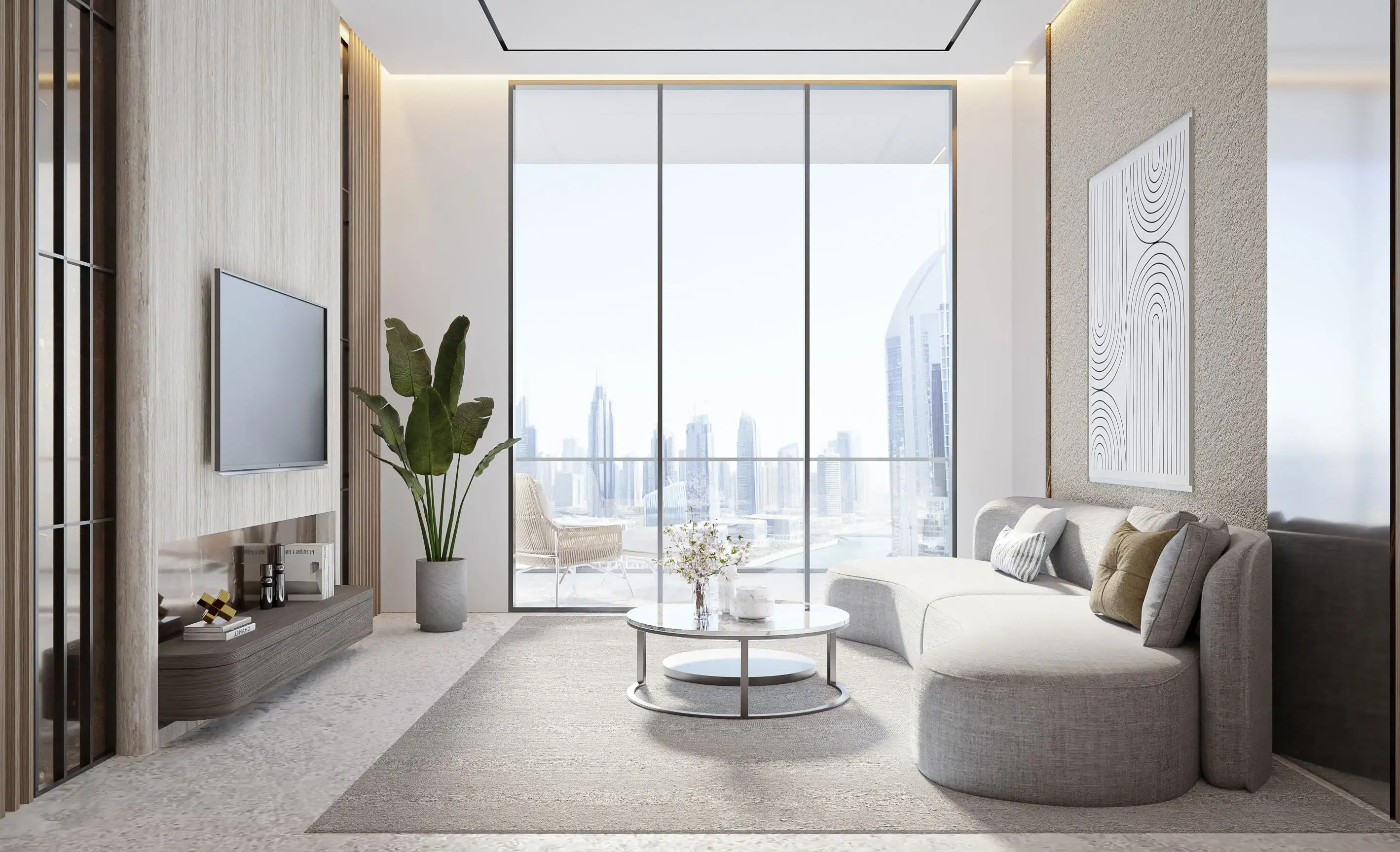 The complex includes one-, two-, and three-bedroom apartments. Layouts emphasize space and functionality: open-plan living areas, large windows, and balconies provide abundant natural light. Interiors are finished in a light neutral palette, using modern materials and minimalist design solutions.