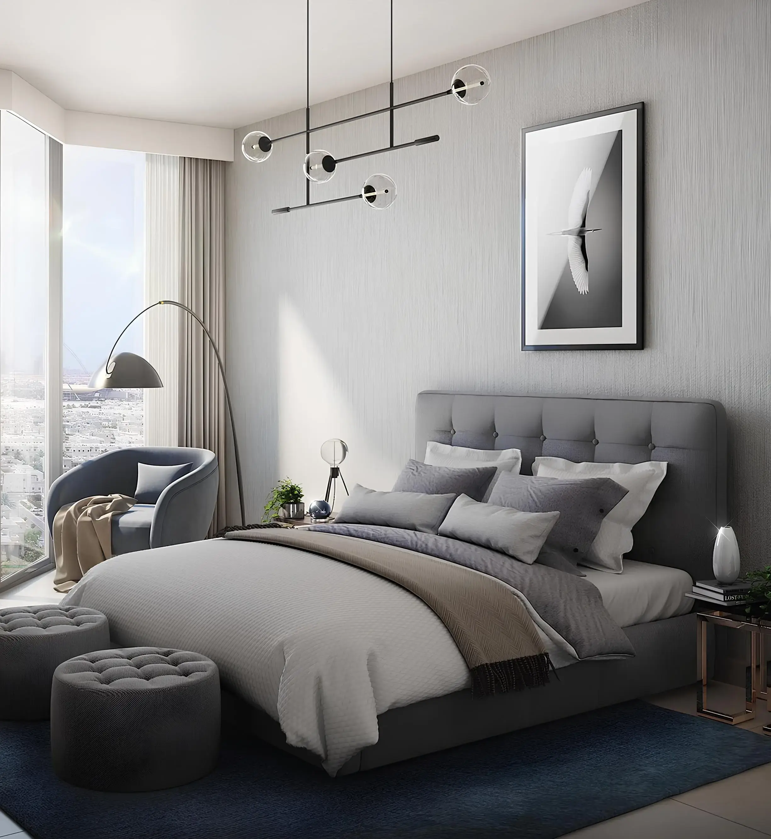 The complex comprises a ground floor, two podium levels, and nine residential floors. The project offers studios and one-bedroom apartments, designed in a neutral color palette and finished with high-quality materials. Spacious layouts and floor-to-ceiling windows ensure an abundance of natural light.