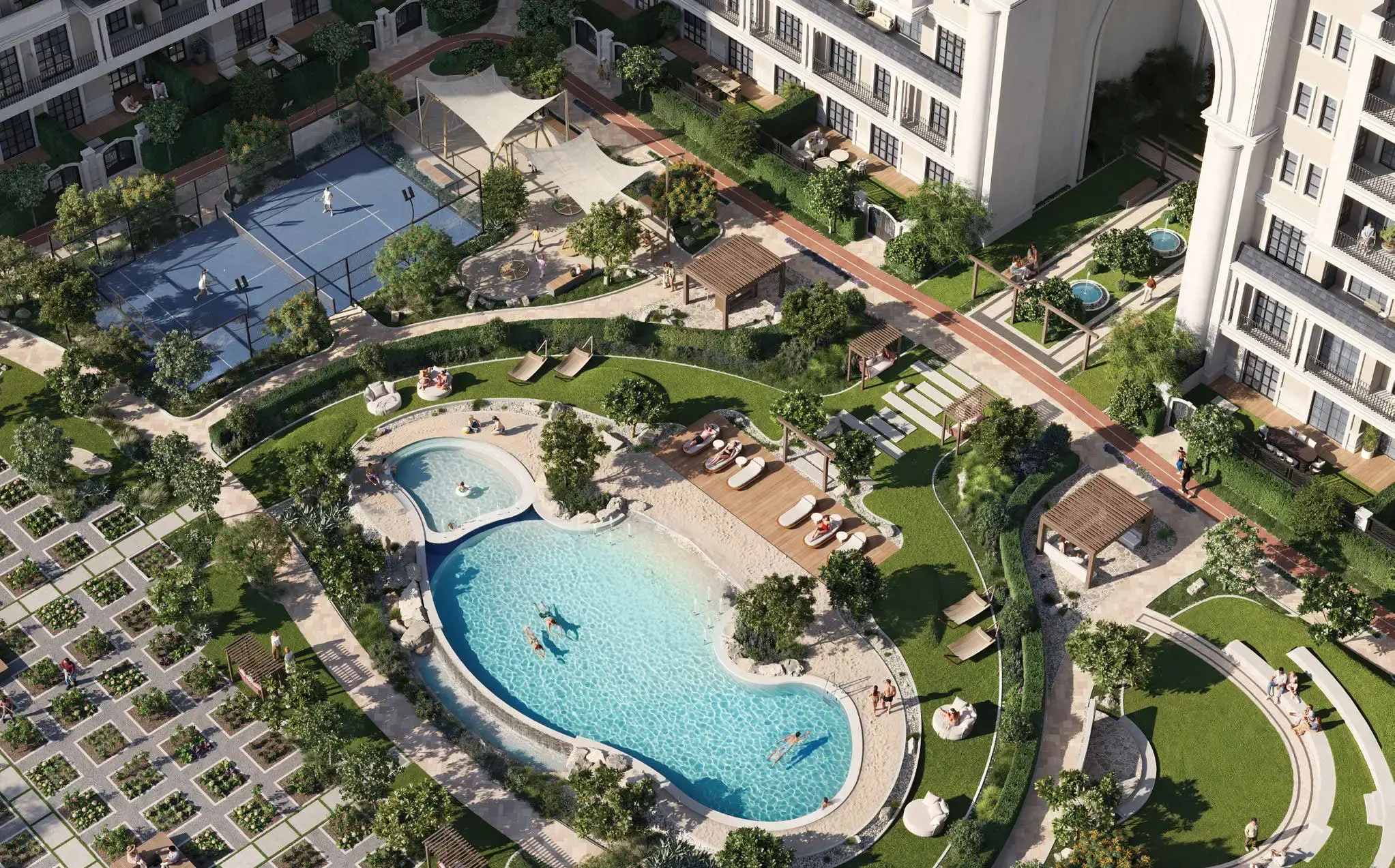 Residents enjoy access to a sandy beach pool, a rooftop indoor pool, a health club with a sauna and SPA, a children’s pool, indoor and outdoor playgrounds for children, barbecue areas, lounges, a private cinema, mini-golf, and much more. The building houses retail outlets for everyday convenience.