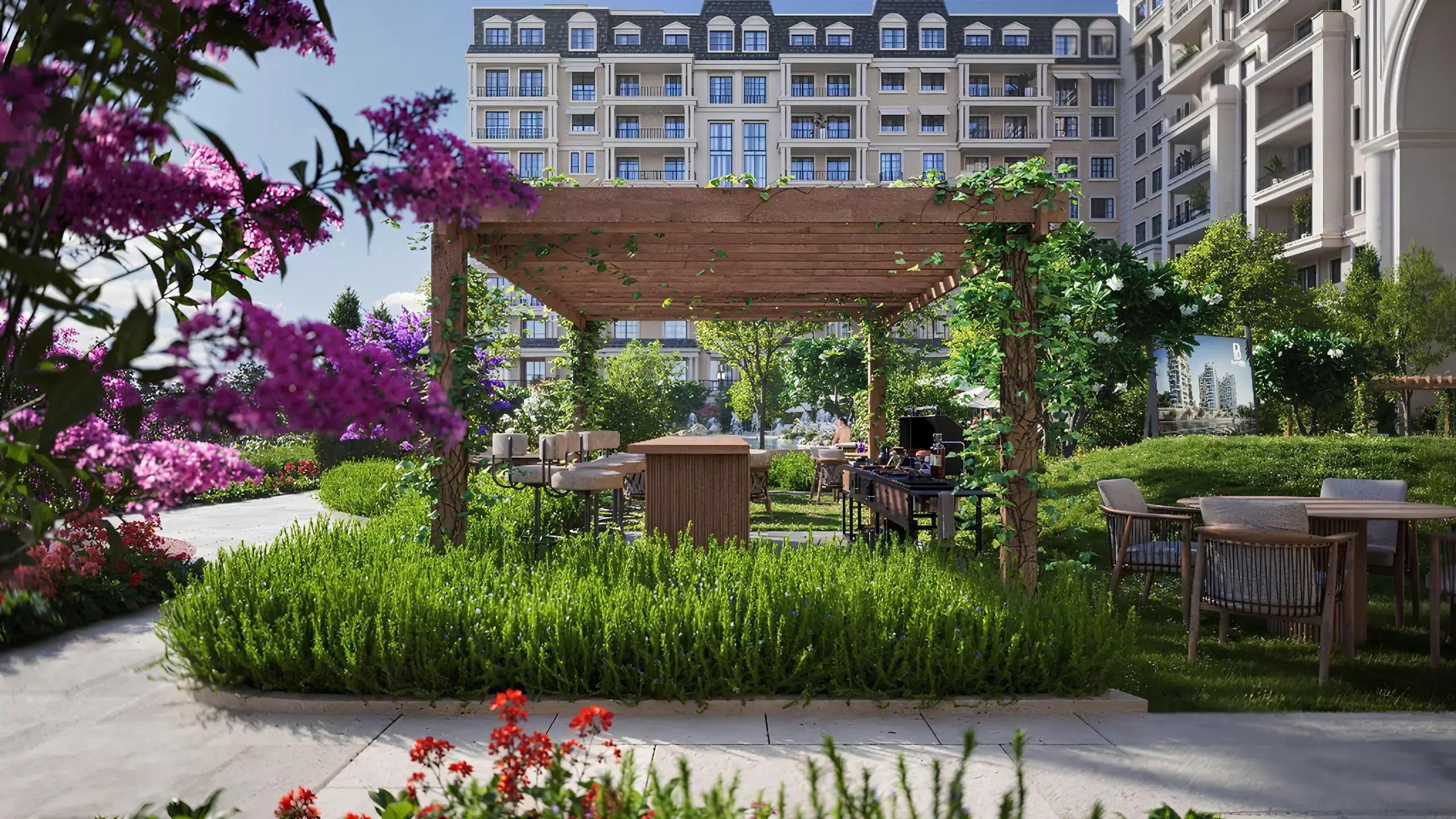 Bab Al Qasr Garden Residence 66 boasts a timeless facade inspired by European countryside style, combining classic charm with modern comfort. The entire development area is landscaped with a garden.