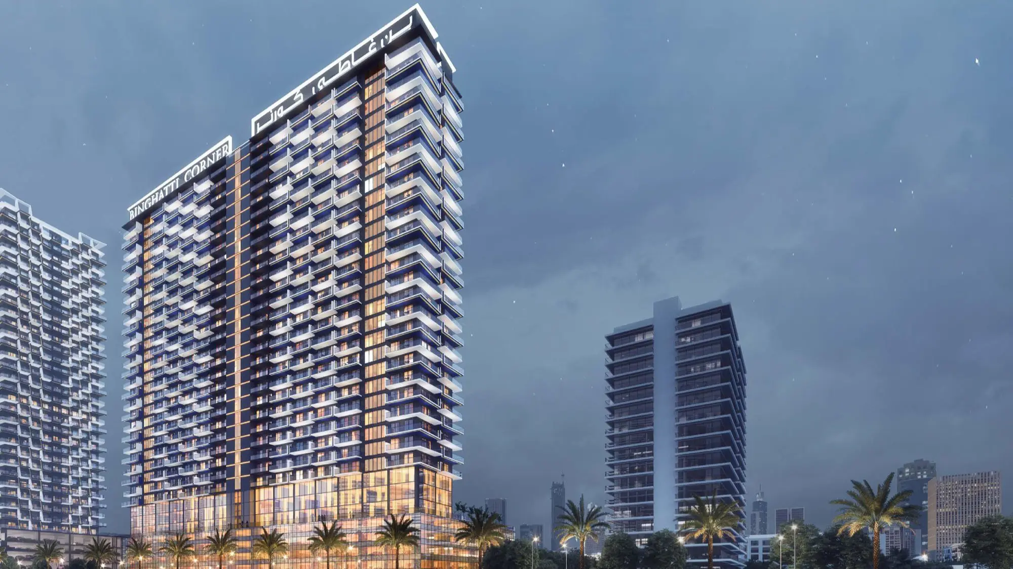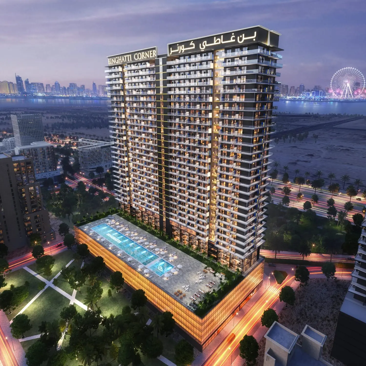 Binghatti Corner is a project by Binghatti Developers that includes 634 luxury residences, commercial and office spaces in one of the best areas of Dubai — Jumeirah Village Circle. The residential complex consists of one basement floor, four podium levels, 29 residential floors and a roof. It features designer apartments with one and two bedrooms, luxurious penthouses, as well as 69 office and 14 retail spaces.