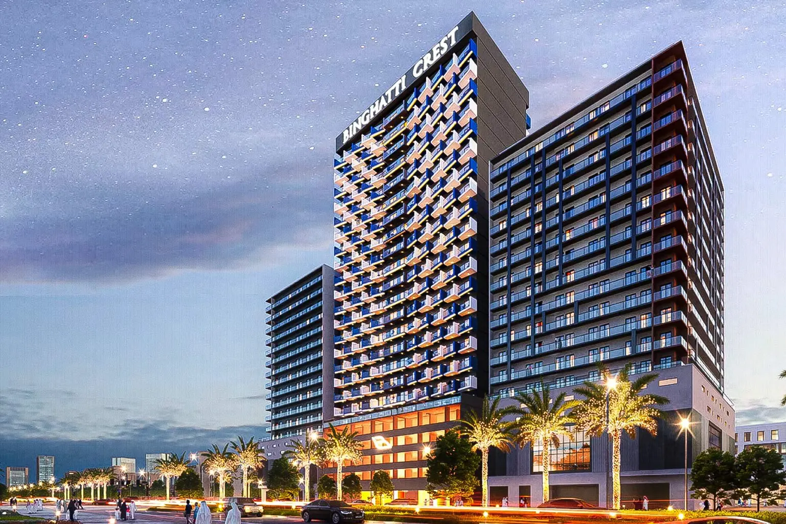 Binghatti Crest is a luxury project by Binghatti, located in the JVC neighborhood. The complex is a 24-storey tower with an amazing architecture, the main feature of which are slightly slanted intertwined balconies and original lighting.
