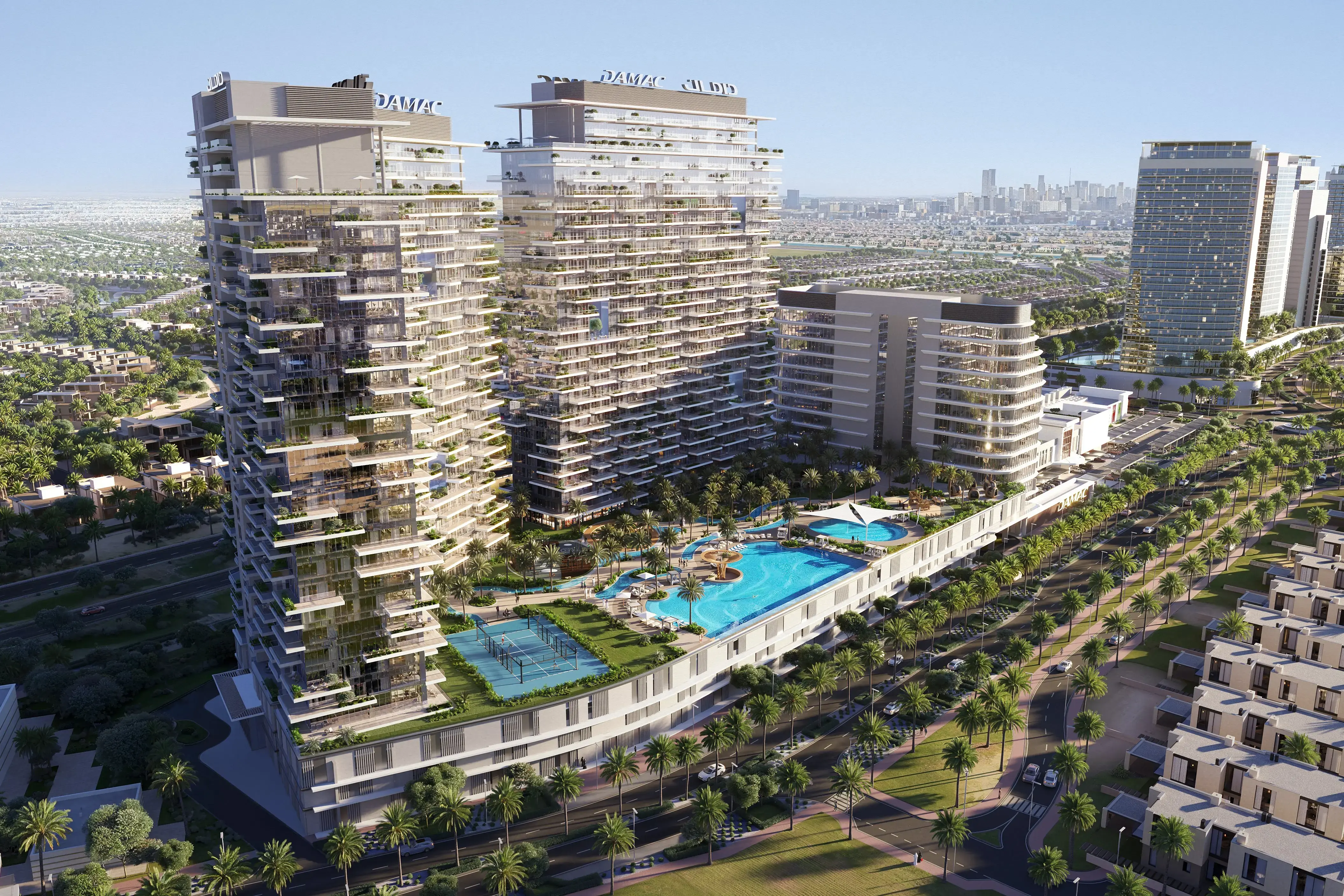 Damac District is a project by Damac located in the Damac Hills community, comprising two residential and one office towers. The architectural concept includes a ground floor, 2 podium levels, 29 and 26 residential floors, and 10 office floors. The windows offer views of Trump International Golf Club and Damac Lagoons. The project combines residential, work, and recreational spaces, creating a harmonious and functional lifestyle. Interiors are thoughtfully designed for comfort and modern living. Amenities for residents include an infinity pool with a resort area, a sunset-view bar and BBQ stations, private dining capsules, a lounge with gaming zones, sports courts, parks, and landscaped green areas. The project boasts a prime location, with Dubai Polo & Equestrian Club, Autodrome, Plantation Polo Club, Miracle Garden, Dubai International Stadium, Global Village, IMG World, and Hamdan Sports Complex all within a 10–15 minute drive.