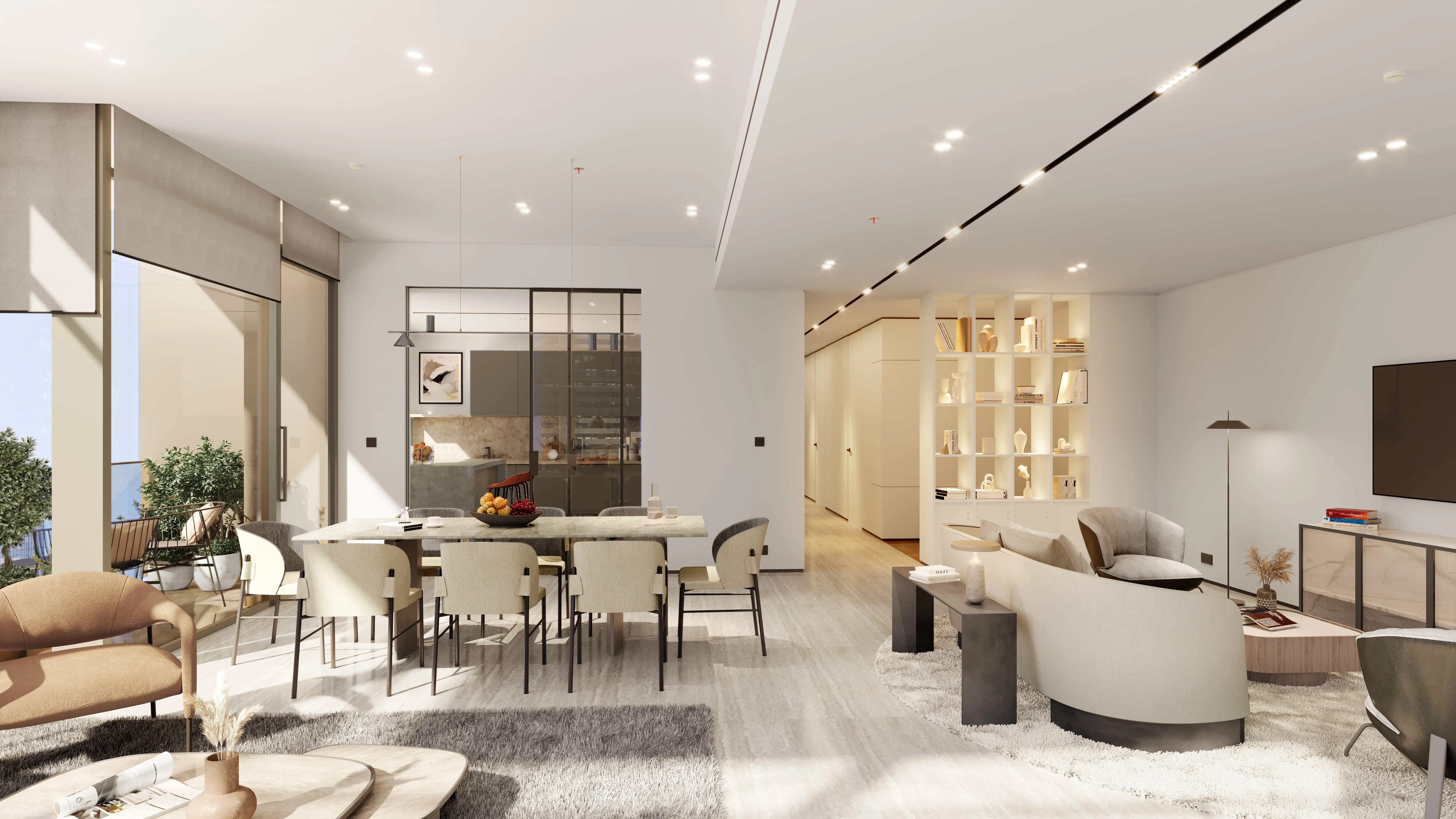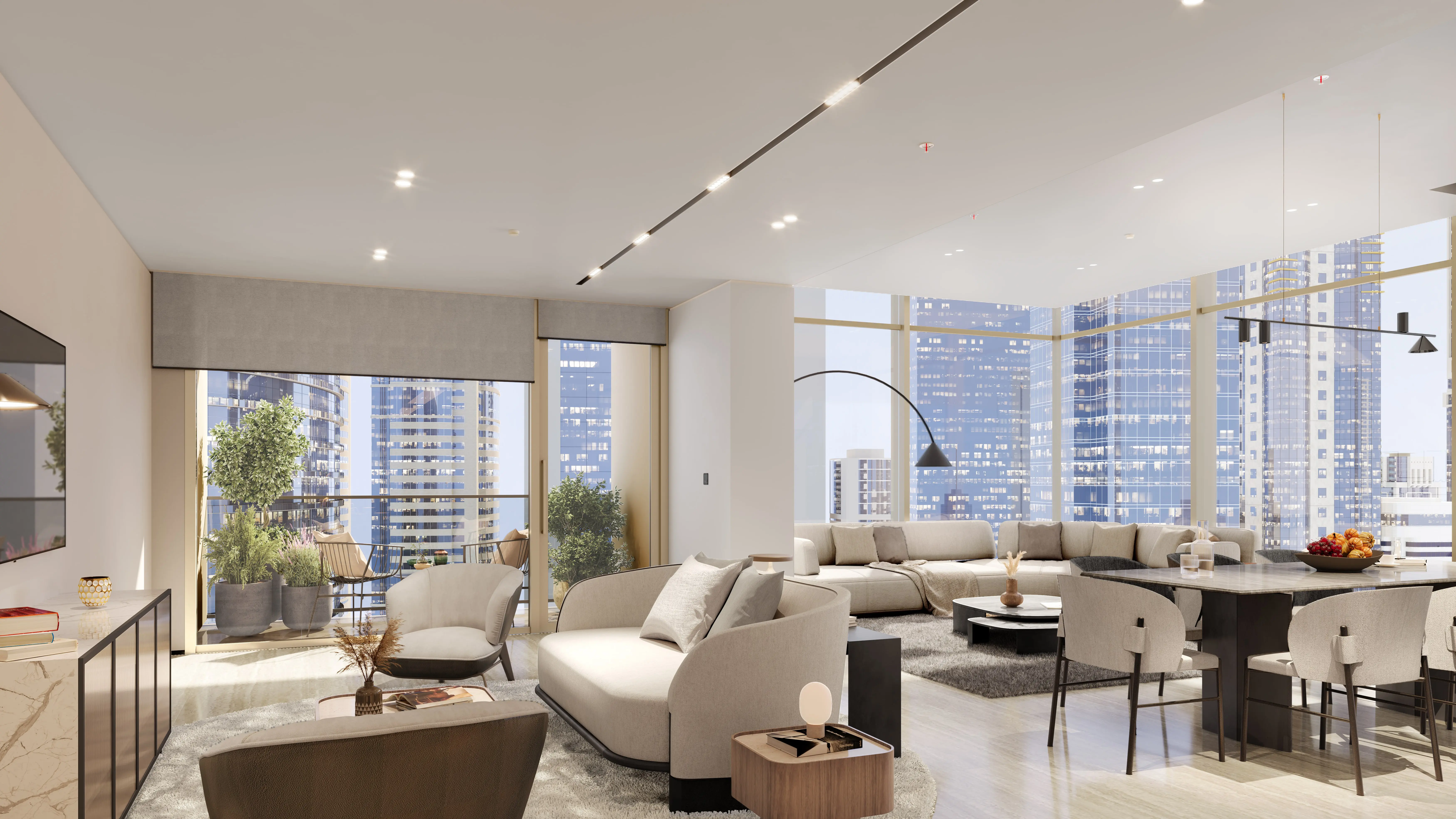 DIFC Living is the first outstanding residential project by Dubai International Financial Centre, located in DIFC, Dubai. The complex is seamlessly integrated into the neighbourhood's infrastructure and creates a harmonious space for living and relaxing. The building has a unique architectural form. The interior of the apartments is designed in soft pastel colours, which creates a relaxing atmosphere, and from the panoramic windows of each residence offers stunning views of the city scenery.