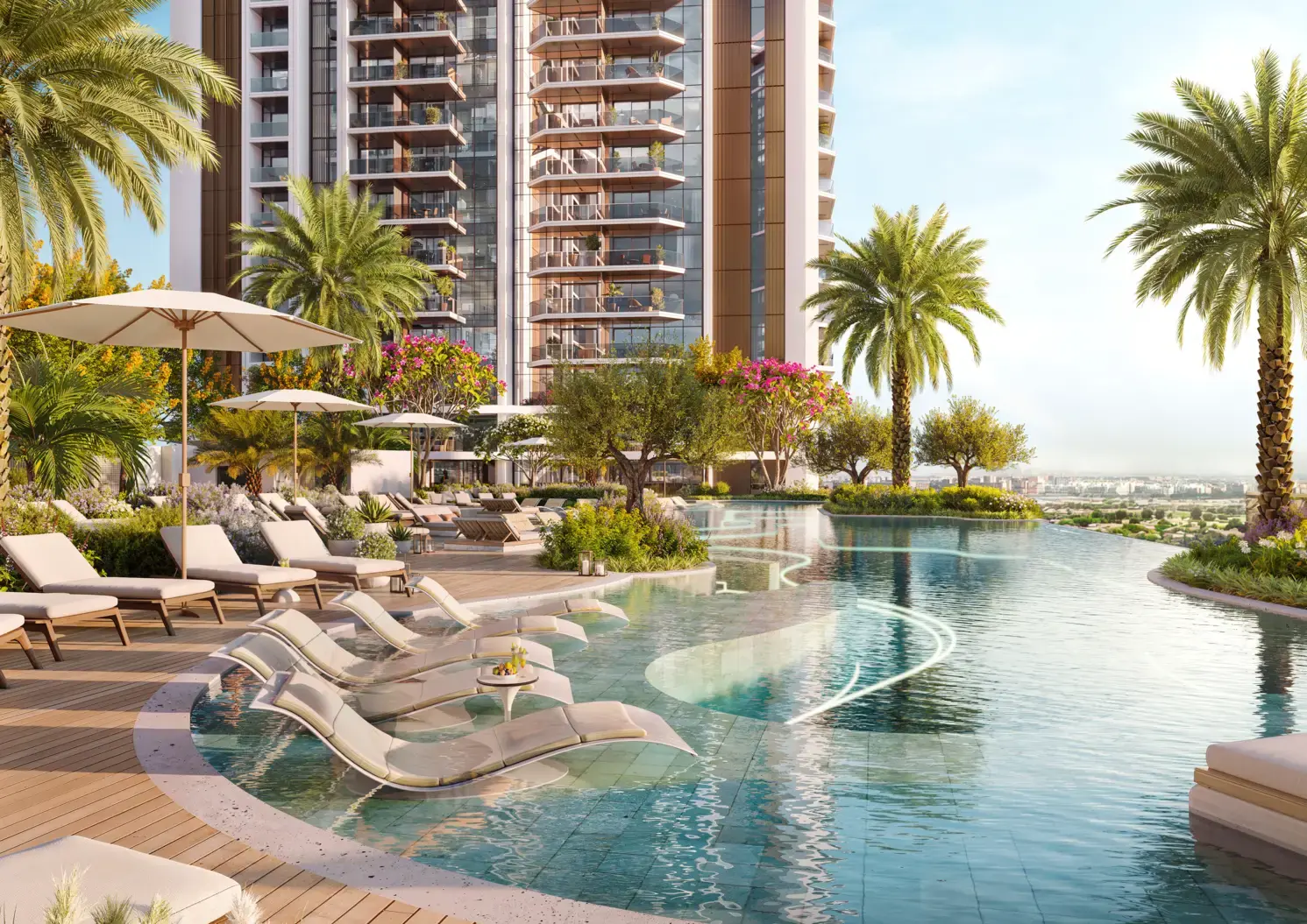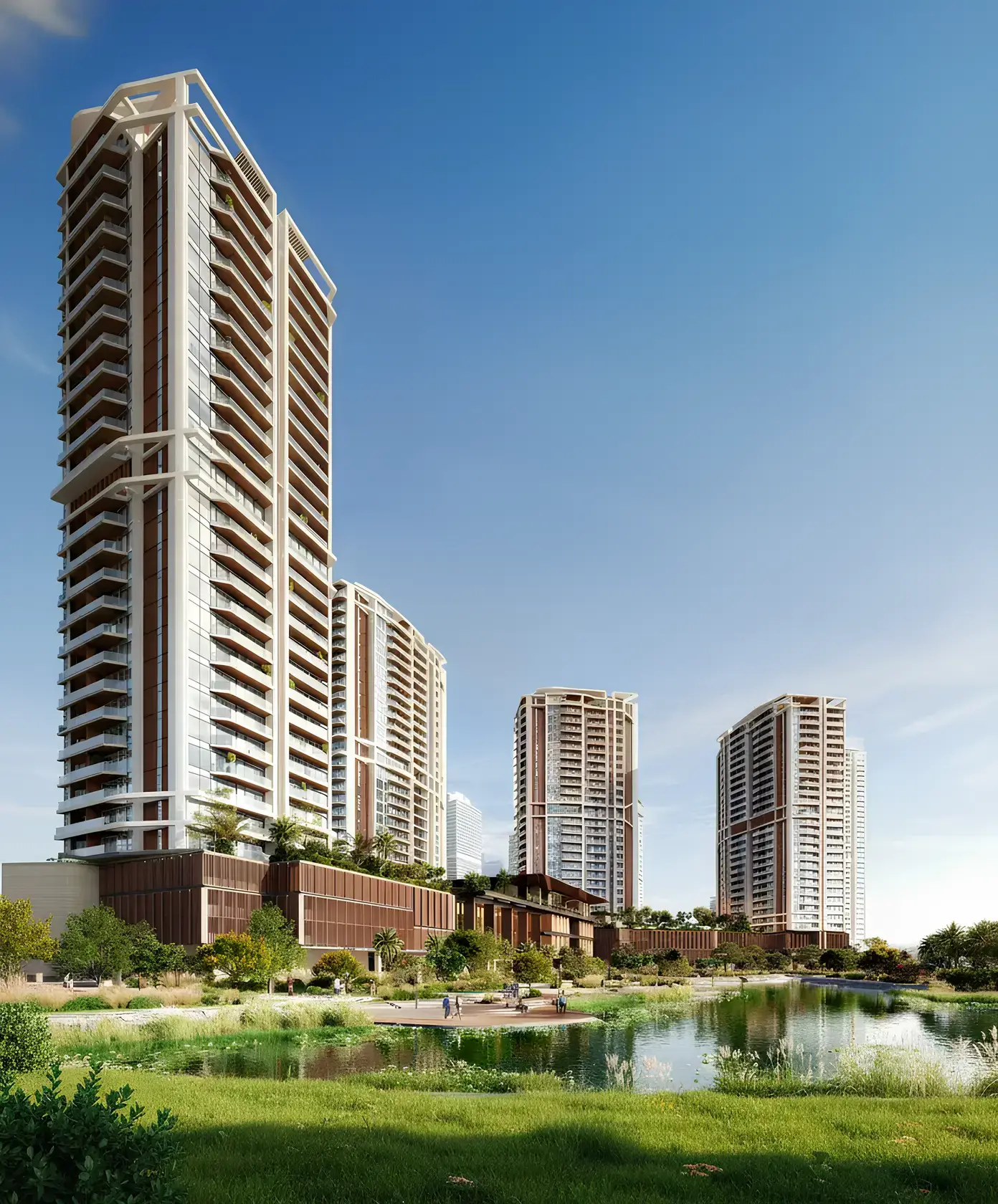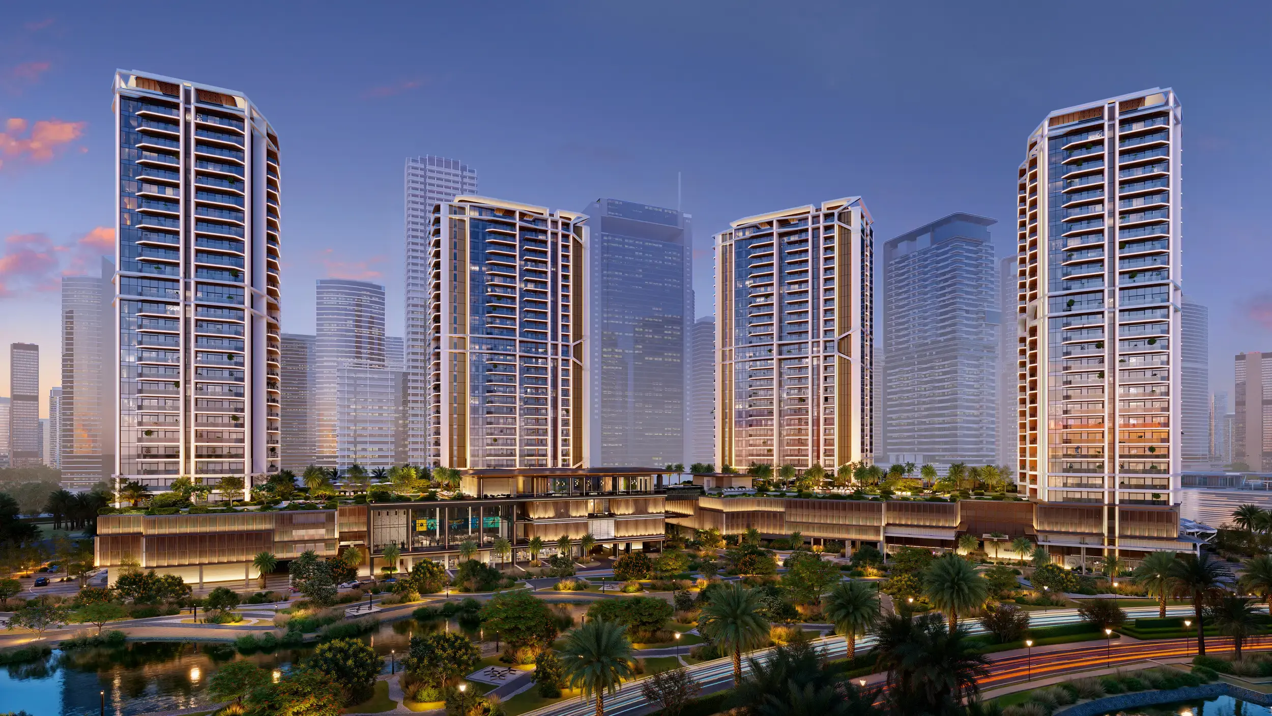 Eltiera Views is a complex by the developer Ellington Properties in the Jumeirah Islands area, Dubai. The project includes four elegant residential towers. Each of them is an outstanding architectural creation, where smooth lines create a harmonious unity. All residential towers have a ground floor, three podium levels, 26 residential floors and a roof. The architecture of the buildings is inspired by the peaceful surface of the lake and the surrounding landscape. The facades harmoniously combine metal and natural materials, setting the rhythm of the outdoor space. They offer apartments with one, two or three bedrooms, some of which include a staff room. There are also penthouses with three or four bedrooms and commercial premises. The interiors are designed with exquisite taste and sophistication. The main amenities of the complex include: a relaxation area by the water with sun beds and gazebos, swimming pools, play areas, playgrounds for children, paddle courts, barbecue areas, gardens, as well as a coworking space with private and shared workspaces. The main attractions can be reached in a short time: Mall of the Emirates — 13 minutes, Palm Jumeirah - 14 minutes, Burj Al Arab - 17 minutes, Al Maktoum International Airport - 27 minutes, Dubai International Financial Centre - 30 minutes, Dubai International Airport — 35 minutes.
