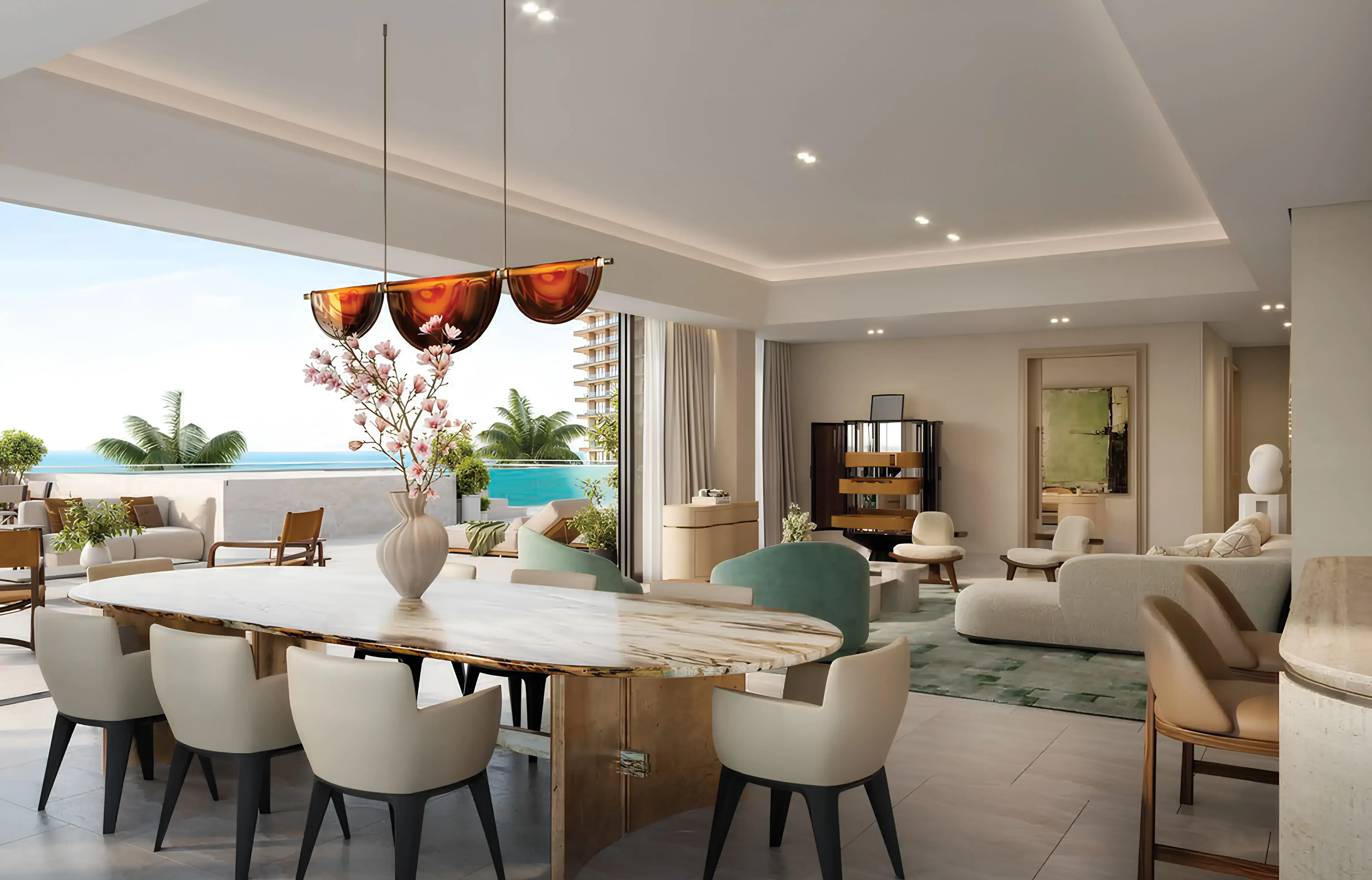 Residents enjoy a variety of amenities, including pools for families and kids, an adults’ pool with terrace and bar, gym, fitness room, spa, private beach, cinema, game room, kids’ club, owners’ lounge, meeting room, private dining room, lobby and lounge areas,restaurants, gardens, dog-walking area, driver’s lounge, and EV charging spots.