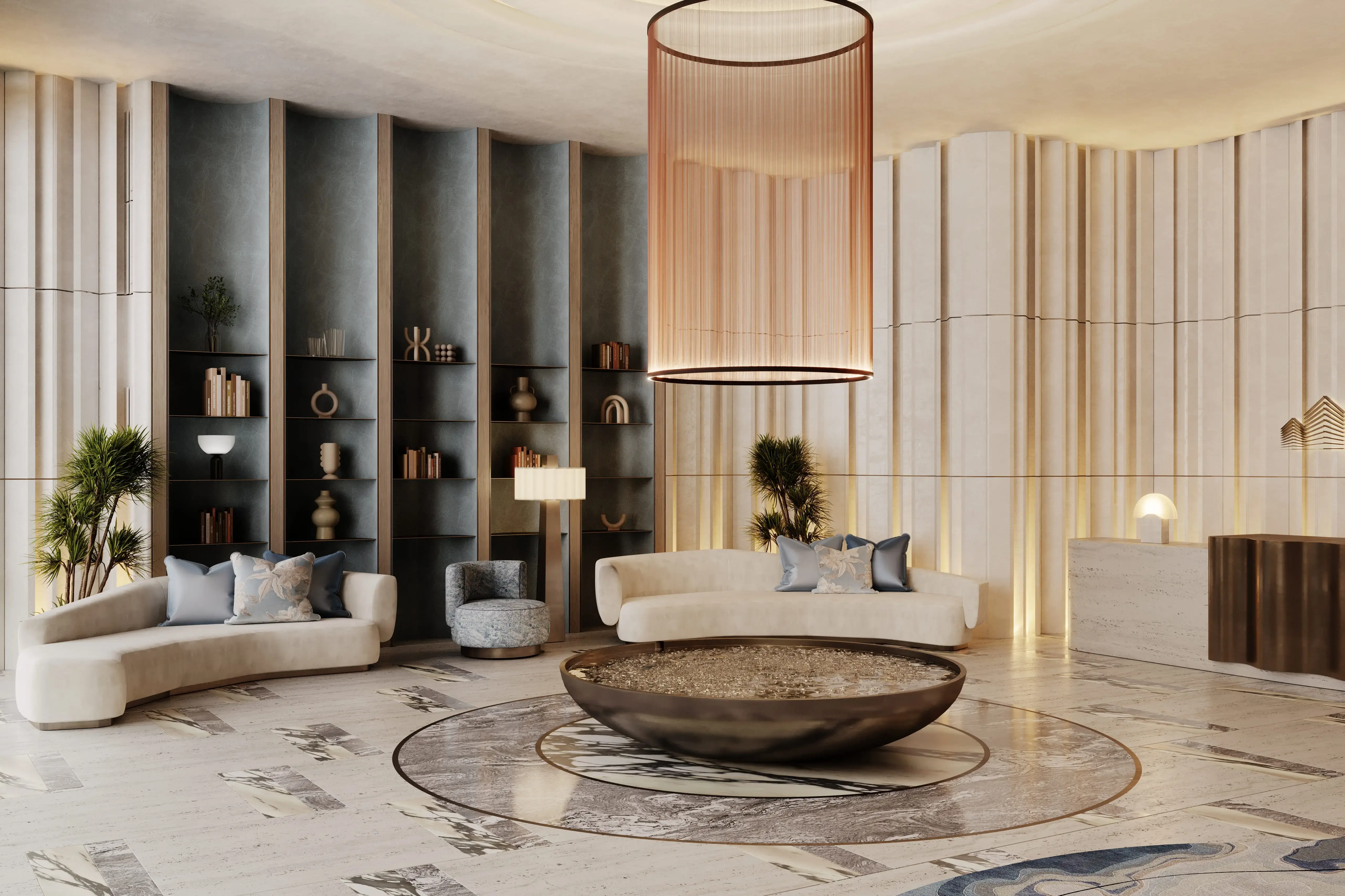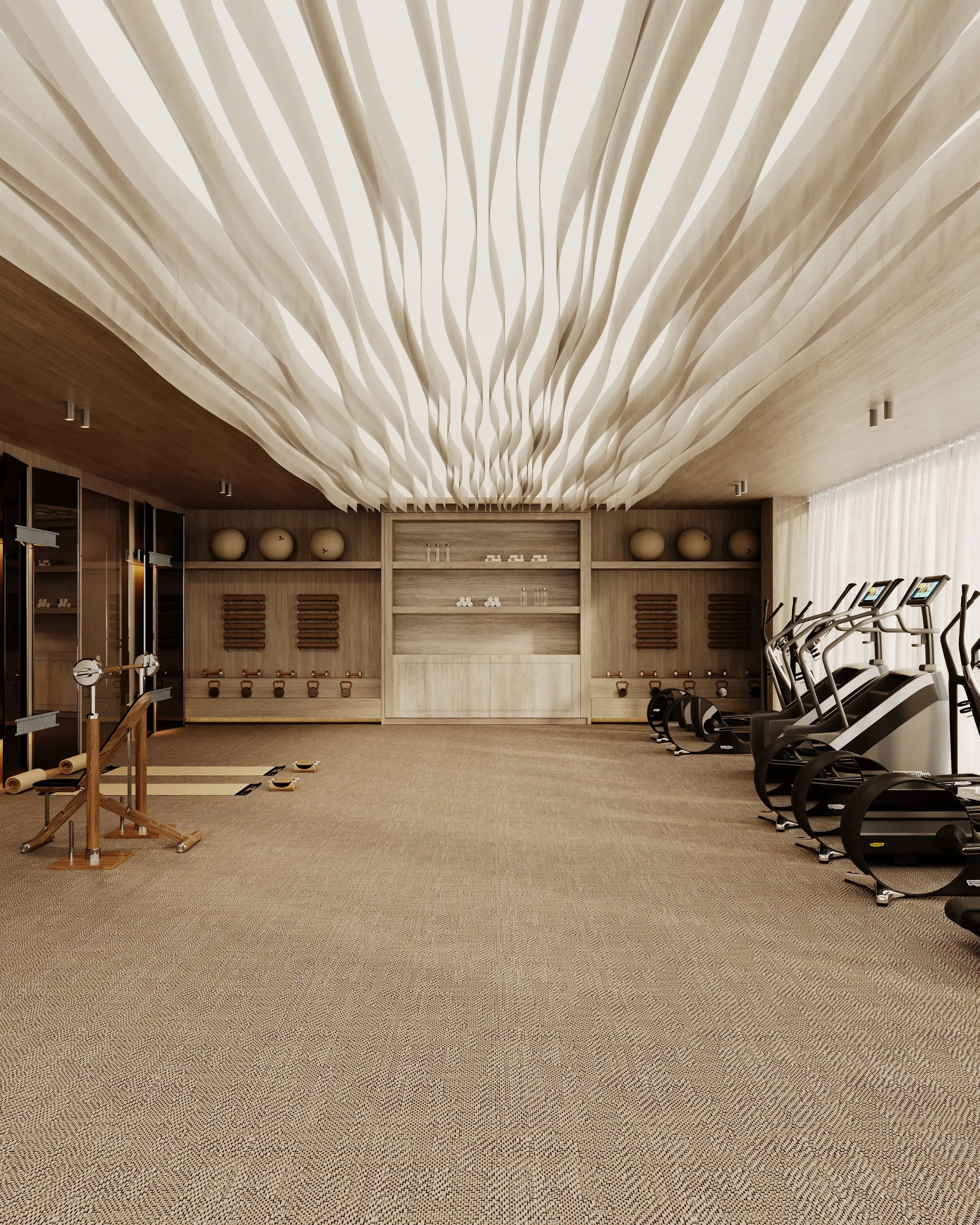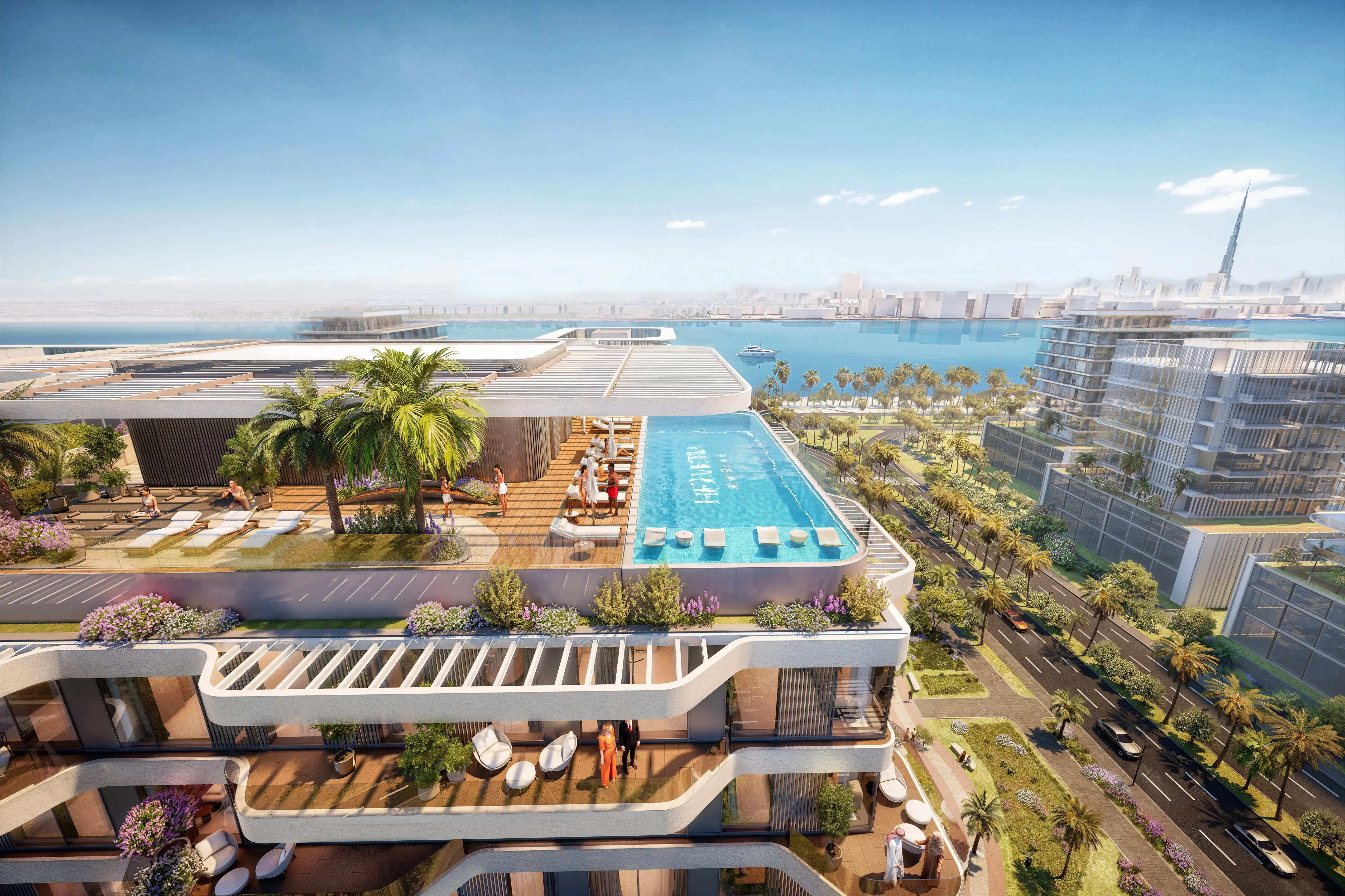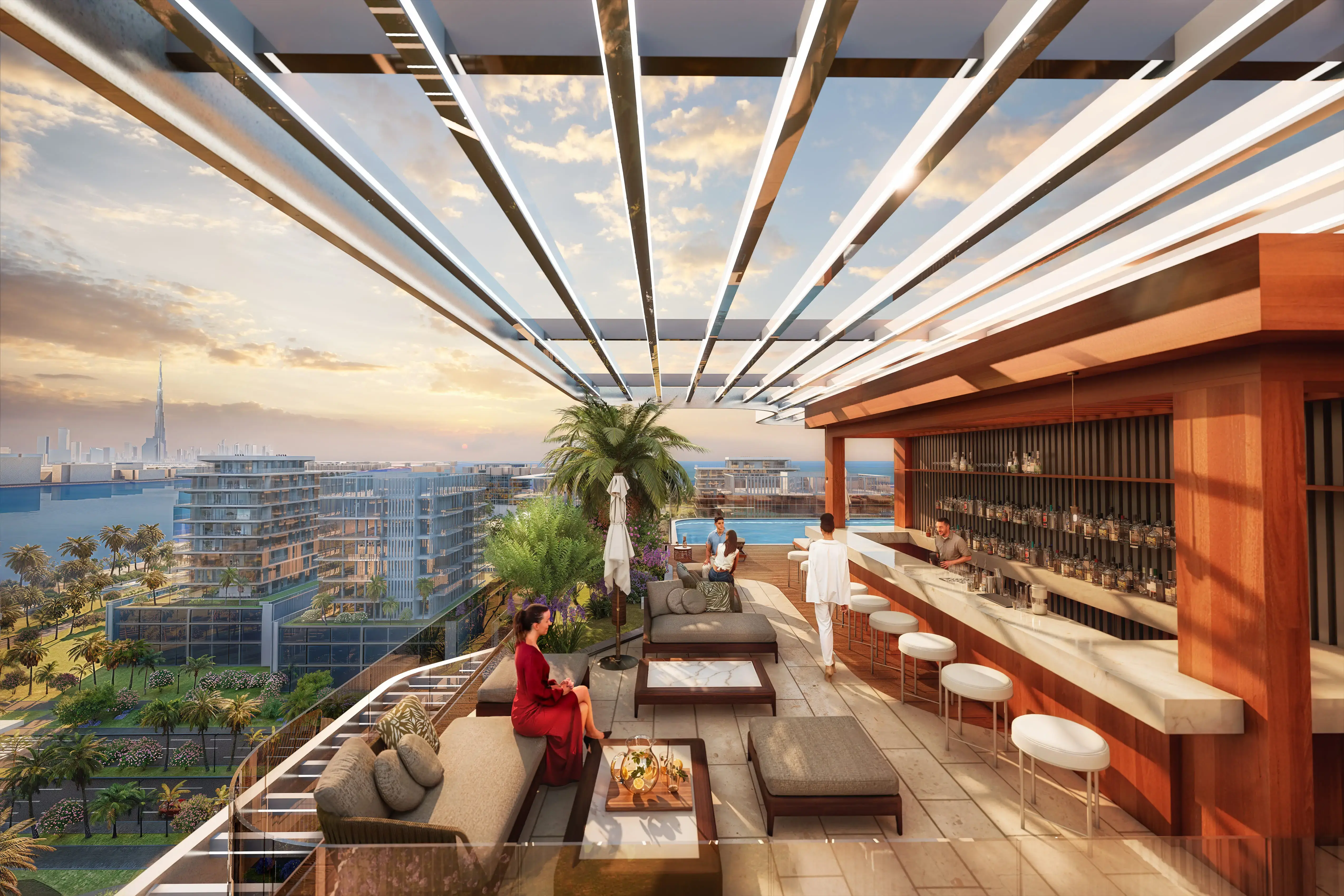 Residents have access to a wide range of amenities, including indoor and outdoor gyms, a social and relaxation area, landscaped garden spaces, a children’s playground, and a jogging track. The rooftop features an infinity pool with panoramic views of the Arabian Gulf, sun loungers, a pool bar, a lounge, and a yoga and meditation space.