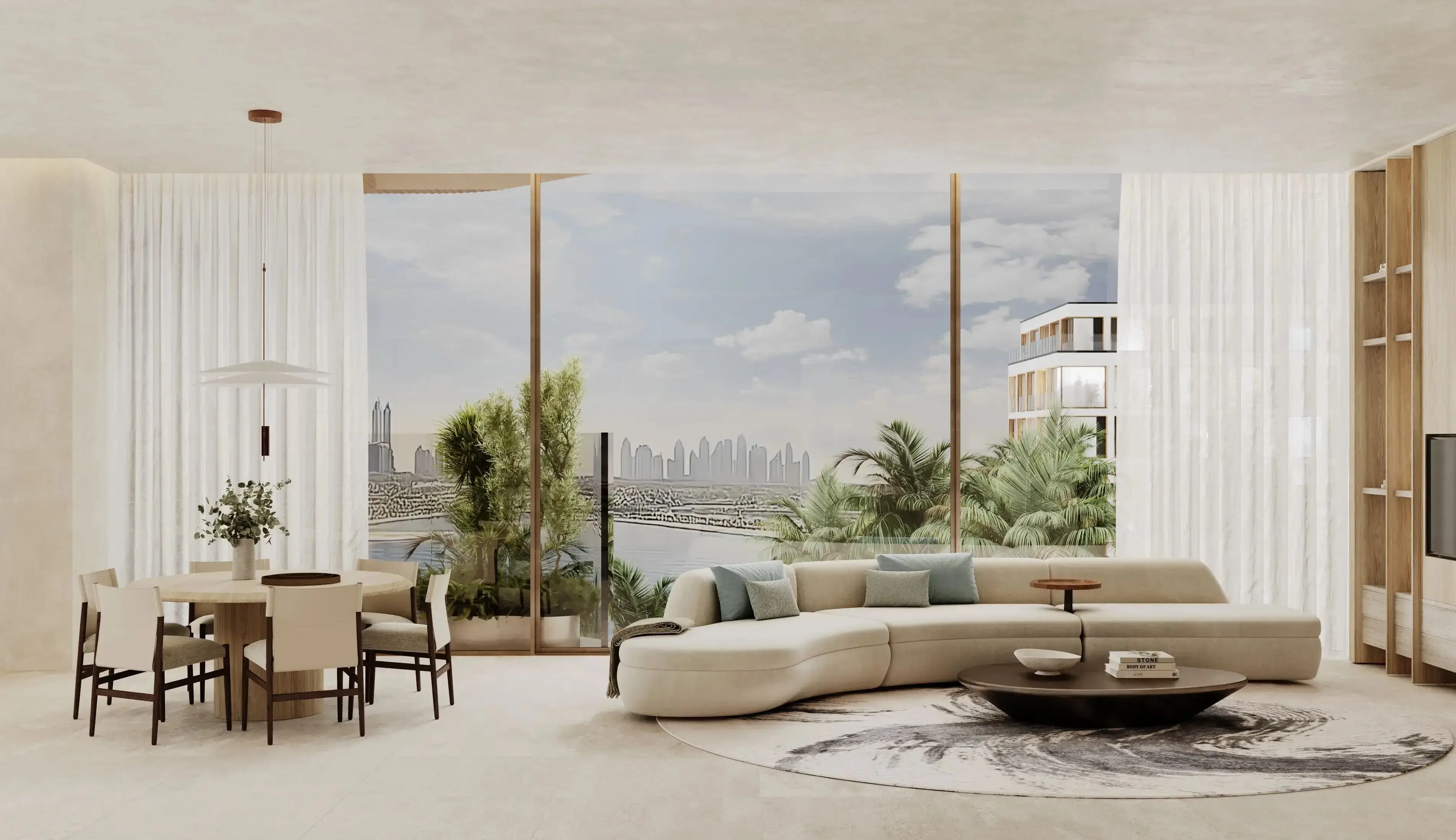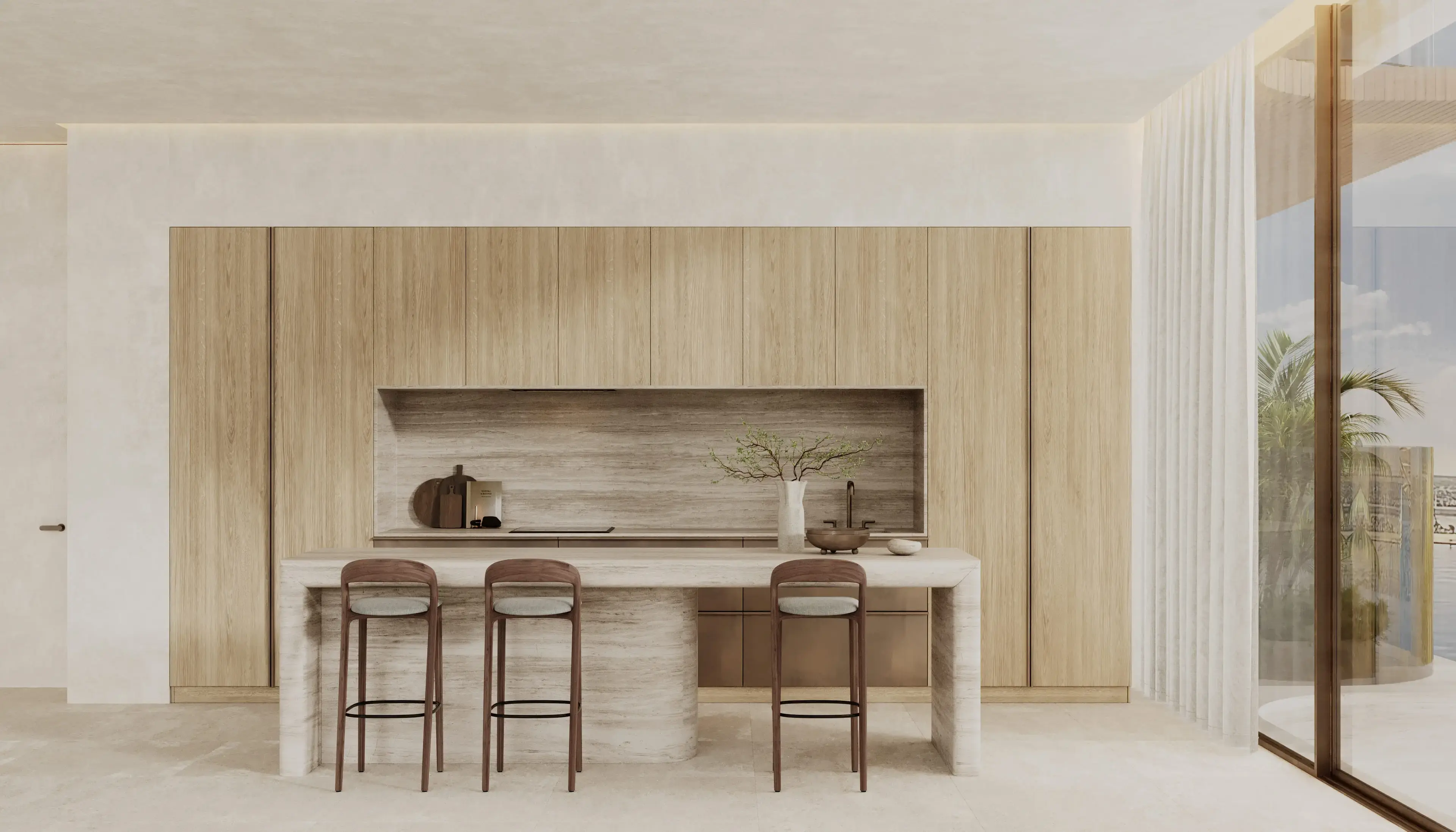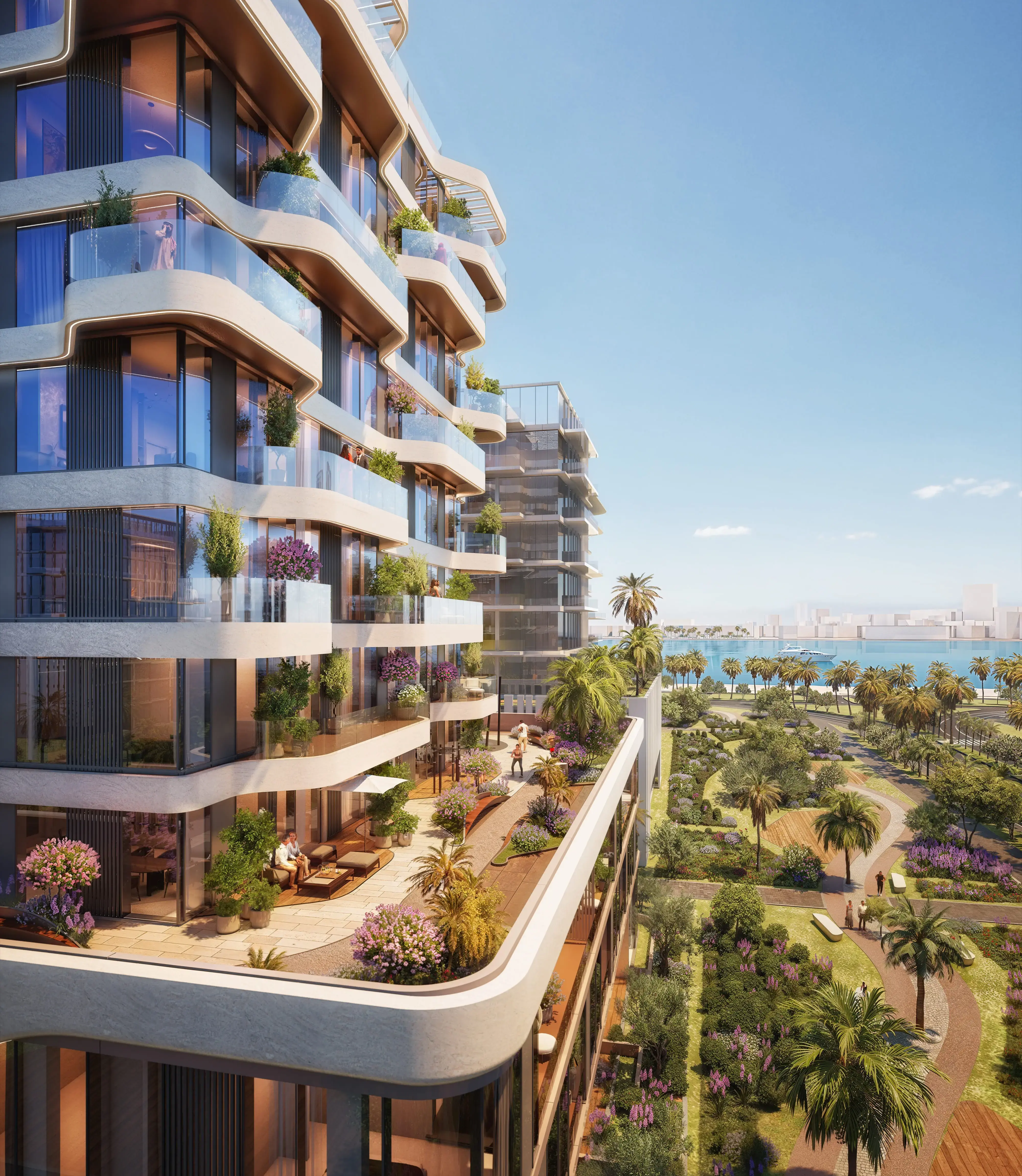 The project offers apartments with 1–3 bedrooms, as well as two-bedroom duplexes with a maid’s room, three-bedroom residences with a maid’s room and a private garden, and one-bedroom layouts with a garden. The interiors are designed in a calm palette with natural tones and expressive accents, reflecting contemporary yacht-inspired aesthetics.
