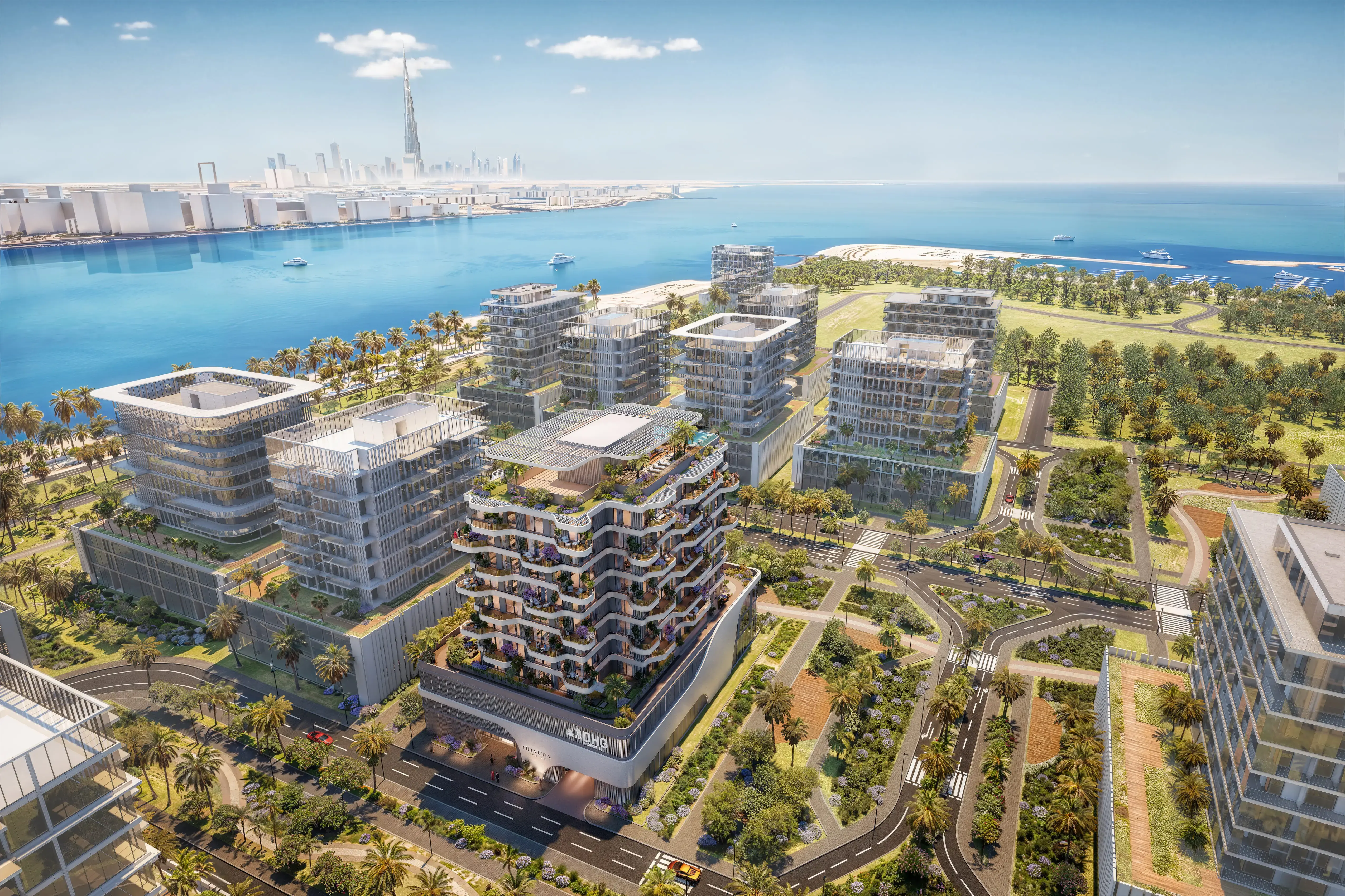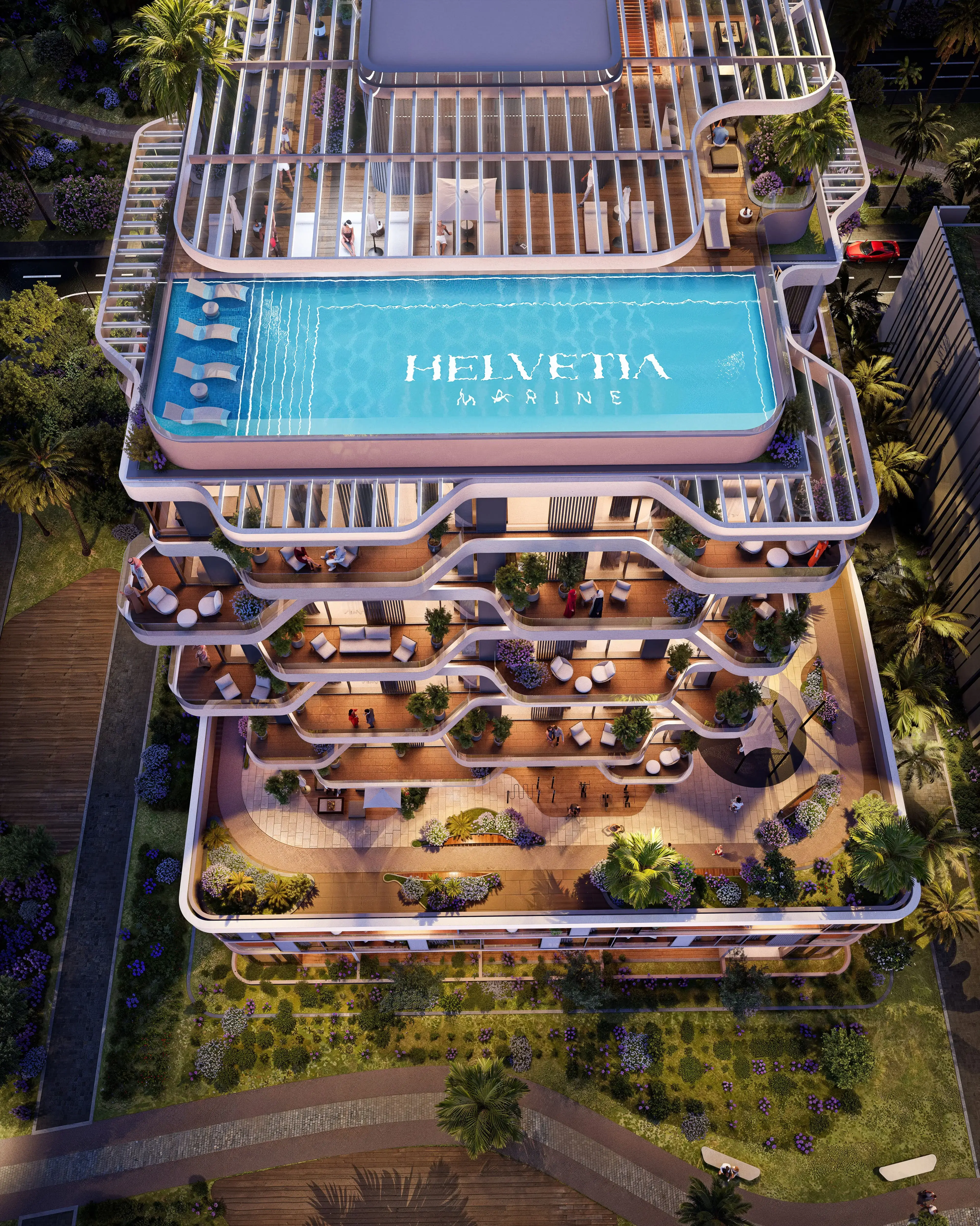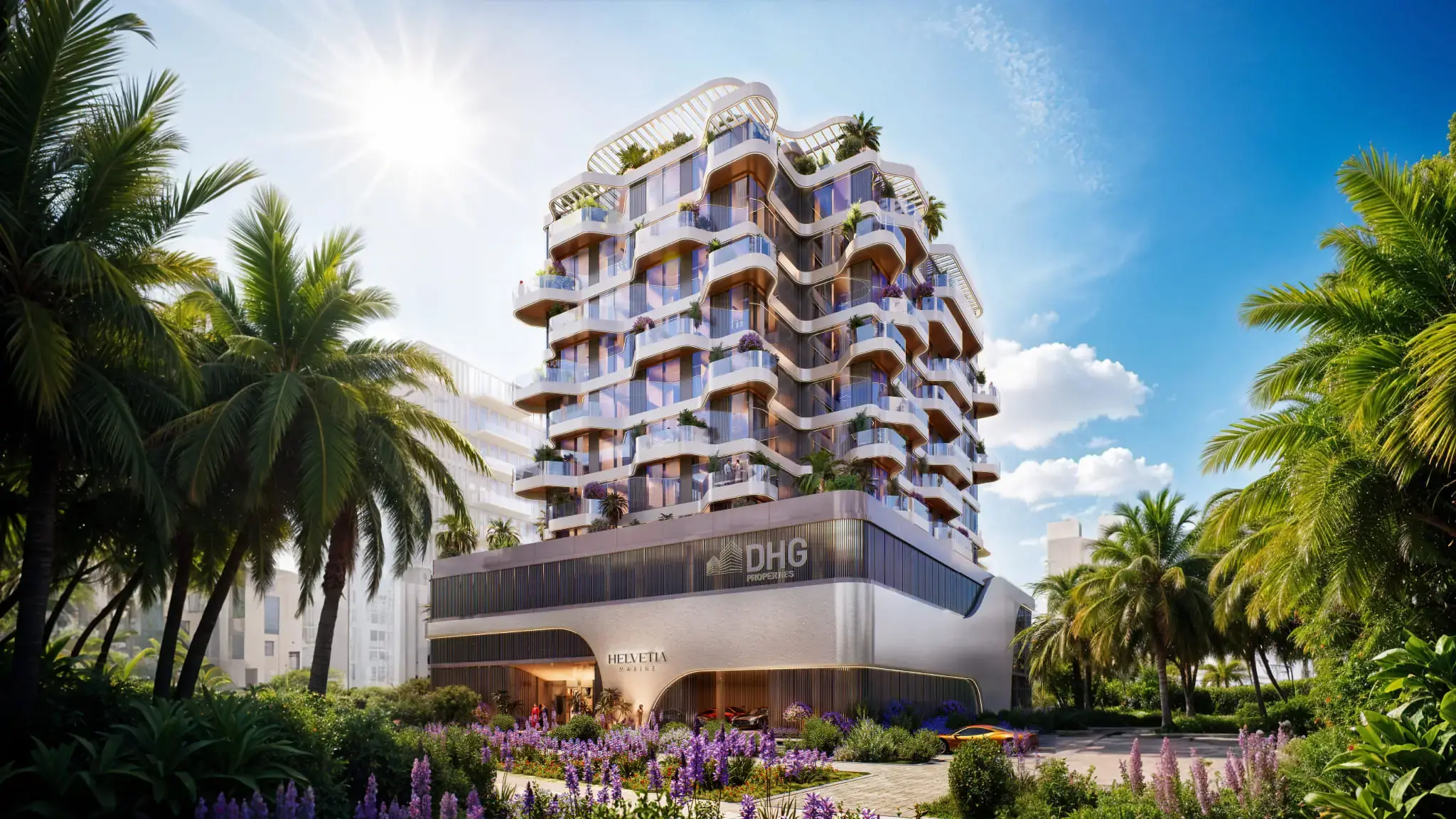 Helvetia Marine is a contemporary development by DHG Properties, located on Dubai Islands. The building includes a ground floor, two podium levels, and eight residential floors. The architecture is inspired by the natural form of corals and features smooth lines and modern contours, creating a distinctive silhouette along the coastline.