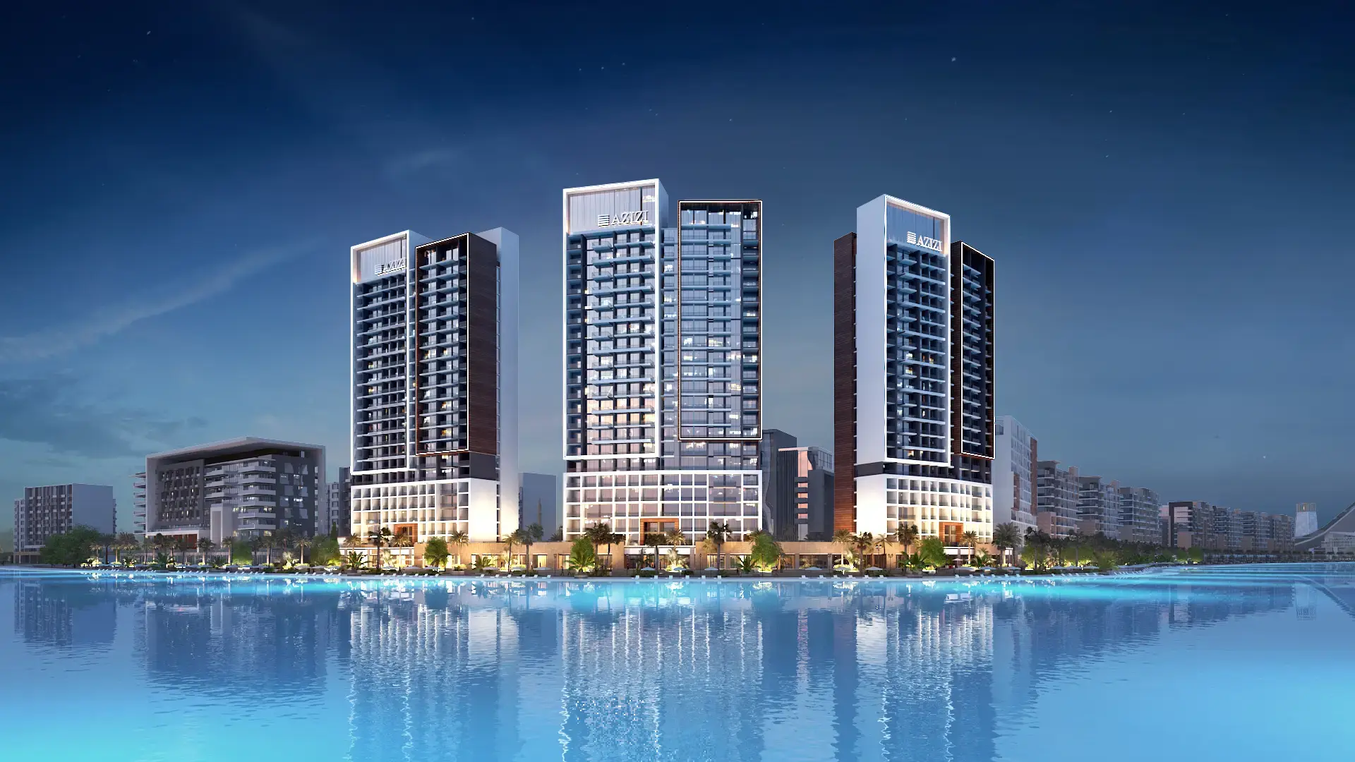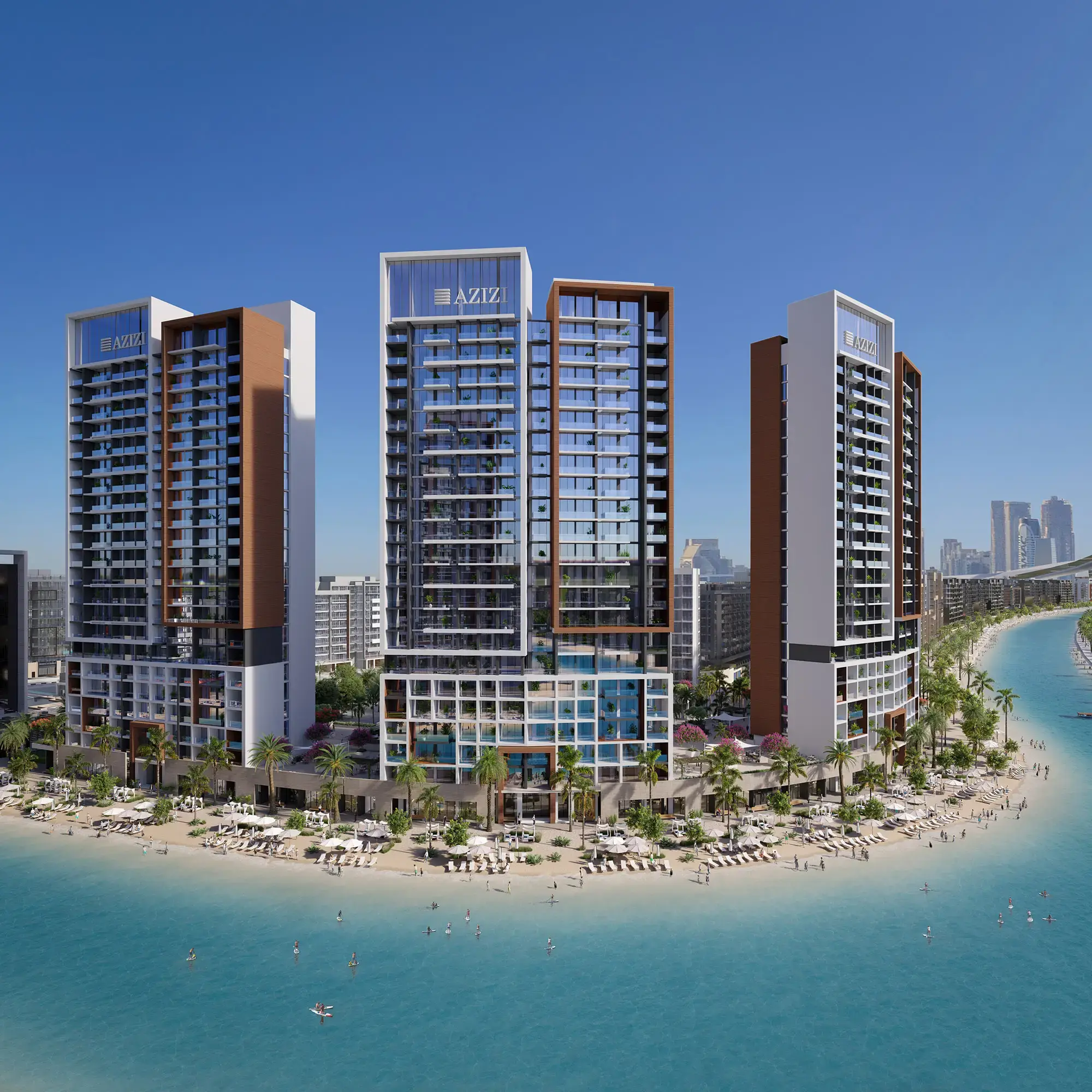 Riviera Beachfront is a residential complex by Azizi Developments, forming part of the large-scale Azizi Riviera project located in the Meydan area of MBR City. Three towers create an elegant architectural landmark along the waterfront. The architecture features a modern design with panoramic glazing and dynamic façade lines. Each tower includes three basement levels, a ground floor, twenty residential floors, and a roof. The project offers studios, one- and two-bedroom apartments, as well as commercial spaces on the lower levels. All residences feature functional layouts, modern interiors, and panoramic glazing that fills the spaces with natural light and opens up views of the surrounding cityscape. Residents have access to a variety of amenities, including swimming pools, fully equipped fitness centers, yoga areas and zen gardens, tennis and basketball courts, children’s play zones, green parks, and walking trails. The development also features supermarkets, shops, cafés, restaurants, barbecue areas, and facilities for leisure and water sports. The complex boasts a prime location: Al Khail Road — 1 minute, Meydan Racecourse — 2 minutes, Meydan One Mall and Meydan Tower — 3 minutes, Festival City and IKEA — 10 minutes, Downtown Dubai — 10 minutes, Sheikh Zayed Road — 10 minutes, Dubai International Airport (DXB) — 15 minutes, Palm Jumeirah — 22 minutes.