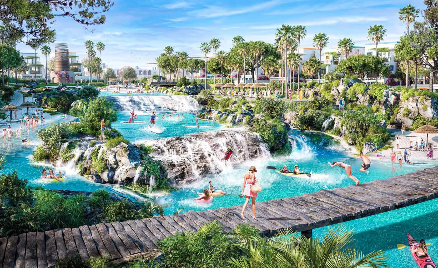 Santorini offers a wide range of facilities including: wellness centre, spa, solarium, jacuzzi, hammam and sauna, restaurants and bars, outdoor cinema, contact zoo, tennis court, skatepark, gym, football pitch, children's playground, laundry service.