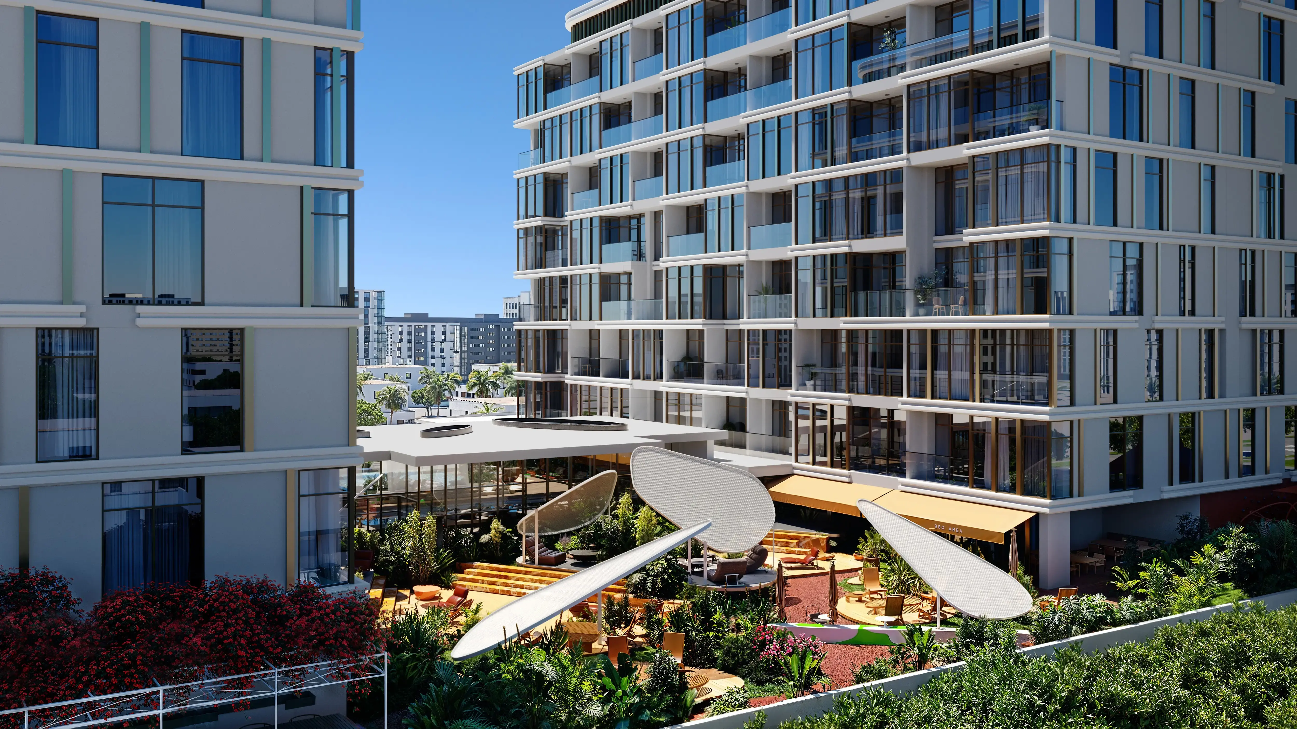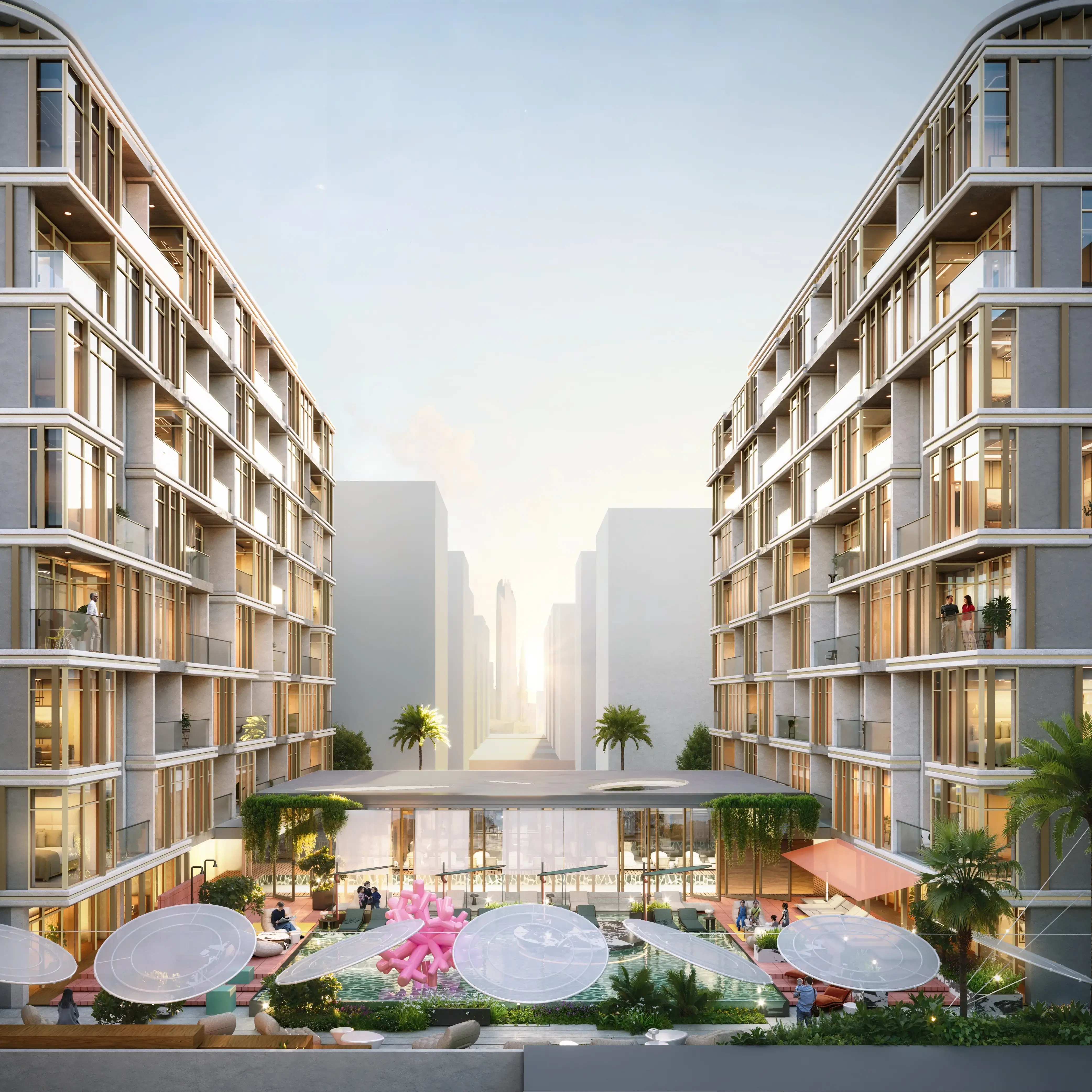 VIBE is a residential complex by Arsenal East Real Estate Development. Two elegant towers form a contemporary architectural silhouette, where the strict geometry of the façade is complemented by wide panoramic windows. Tower A and Tower B include a ground floor, two podium levels and eight residential floors. The architecture reflects a modern approach to design: clean geometry, extensive glass surfaces and a rhythmic façade structure create a stylish and expressive building. VIBE offers studios and one-bedroom apartments. The interiors convey an atmosphere of creative expression: rich tones, contrasting textures and thoughtful lighting form an impressive space filled with warmth and personality. The complex offers a wide range of amenities for comfortable urban living, including an indoor swimming pool, a fitness area and yoga zone, a library, a cinema, a coworking space, modern meeting rooms, a children’s play area and a multi-level parking facility. Thanks to its convenient location, residents can easily reach key destinations in the city: Dubai Airport – 15-20 minutes, Downtown Dubai – 15-20 minutes, Dubai Design District – 15 minutes, DIFC – 15 minutes, Museum of the Future – 10-15 minutes, Dubai Opera – 15-20 minutes.