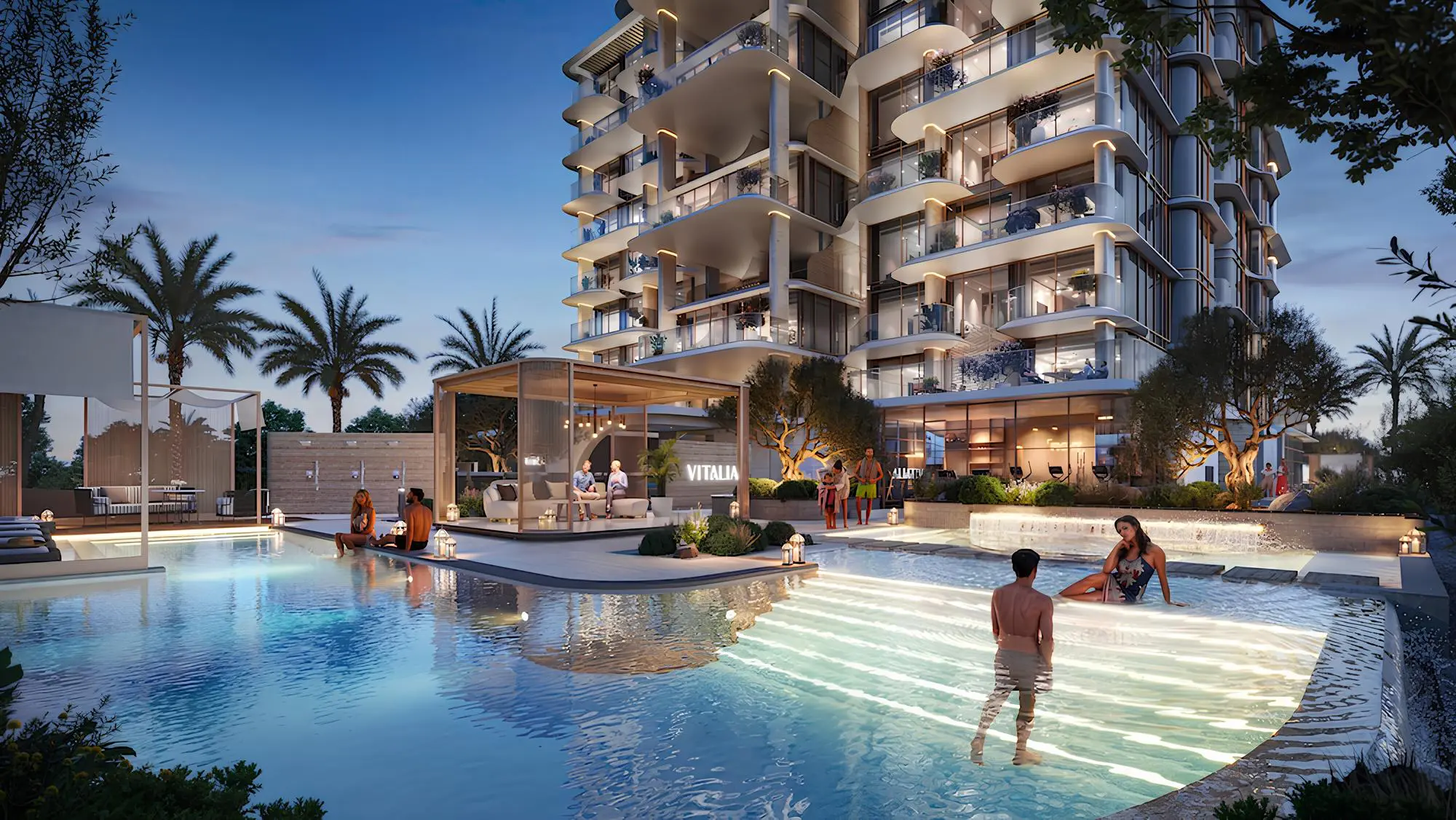Vitalia Palm Jumeirah Residences is an exclusive residential complex presented by Devmark. The project is located on the famous Palm Jumeirah Island in Dubai. The developer is Pinnacle AKS Real Estate Development. The building consists of a basement floor with parking, a ground floor with a spacious lobby, and nine residential floors. Panoramic glazing gives the facade an additional airiness. There are two- and three-bedroom apartments, as well as duplexes and penthouses with four bedrooms, for sale. Each residence has a spacious balcony. The interiors are designed in the European style — the Italian concept of “dolce far niente”, which values moments of peace and the ability to enjoy the present. High ceilings and panoramic windows fill the rooms with light. All apartments are equipped with high-end bathroom fixtures, luxury flooring, and premium-brand kitchen appliances. Smart home and concierge services ensure a comfortable stay. Vitalia Palm Jumeirah Residences features amenities including a landscaped pool with a dedicated children's area, a fitness center, and recreational areas. The complex's prime location allows residents to reach Dubai Marina and Dubai Harbour in just 15 minutes, Mall of the Emirates in 20 minutes, and DXB in 30 minutes.