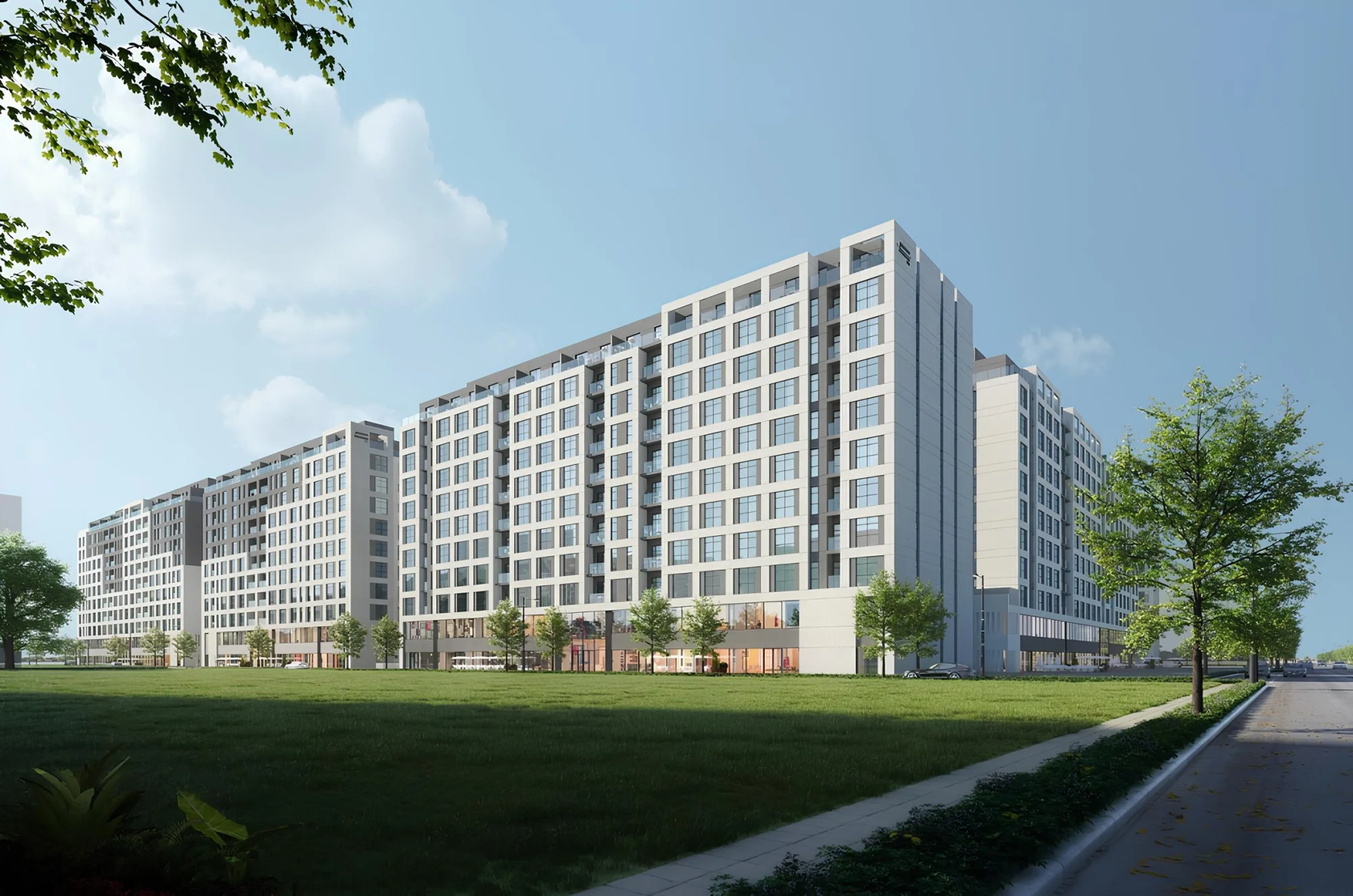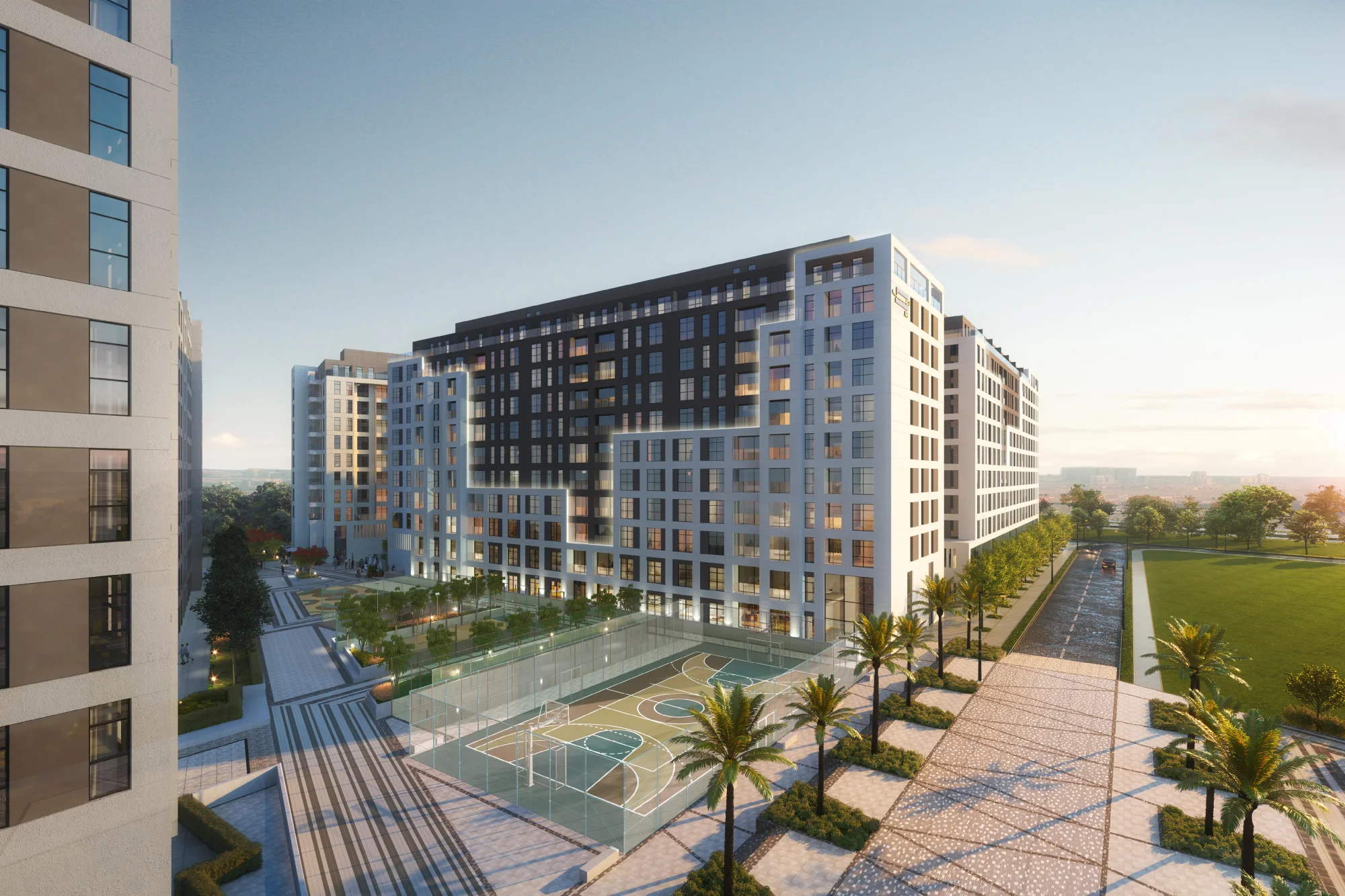 The project consists of a complex of 10 buildings, including a ground floor and 9 residential floors, with studios and apartments with 1-3 bedrooms. The exterior of the buildings is characterized by a modern and elegant design that harmoniously fits into the surrounding landscape. The facades of the buildings are decorated in bright colors, creating a feeling of lightness and spaciousness. A landscaped area with greenery and recreation areas complements the overall picture. The interiors of the apartments are made using high-quality materials and modern design solutions. The thoughtful layout allows for the most efficient use of space. Large windows provide good natural light.