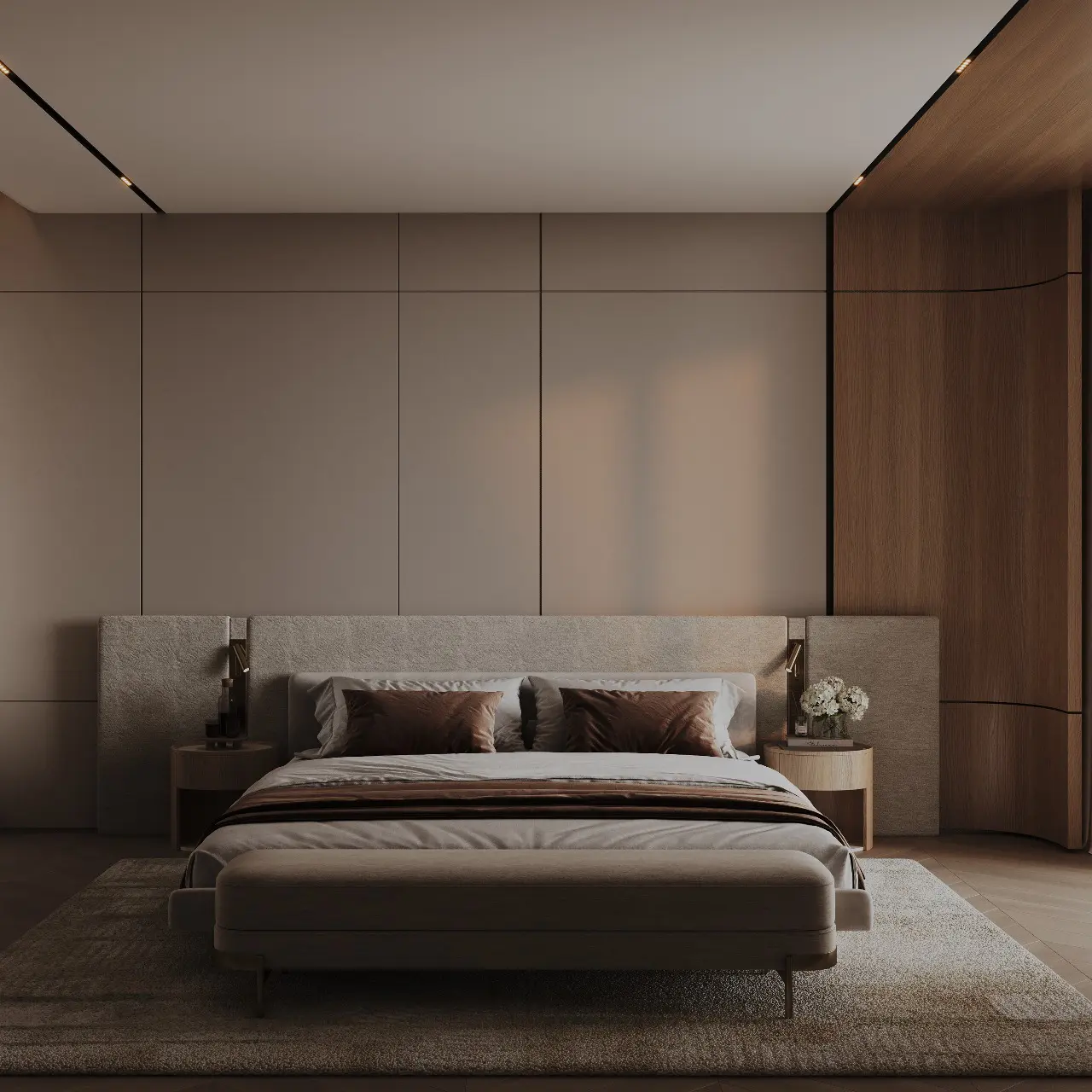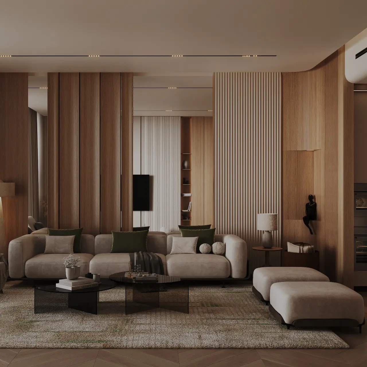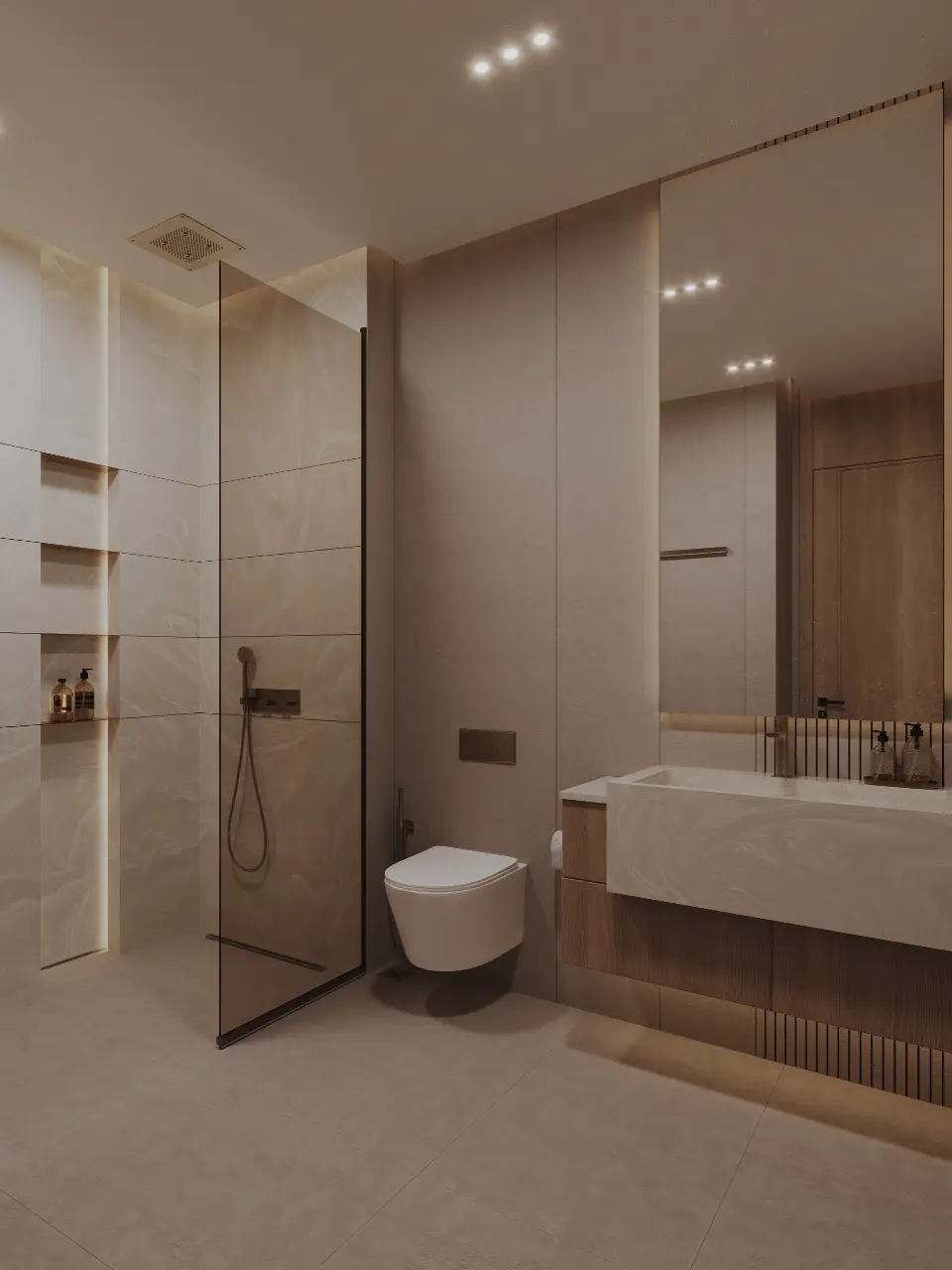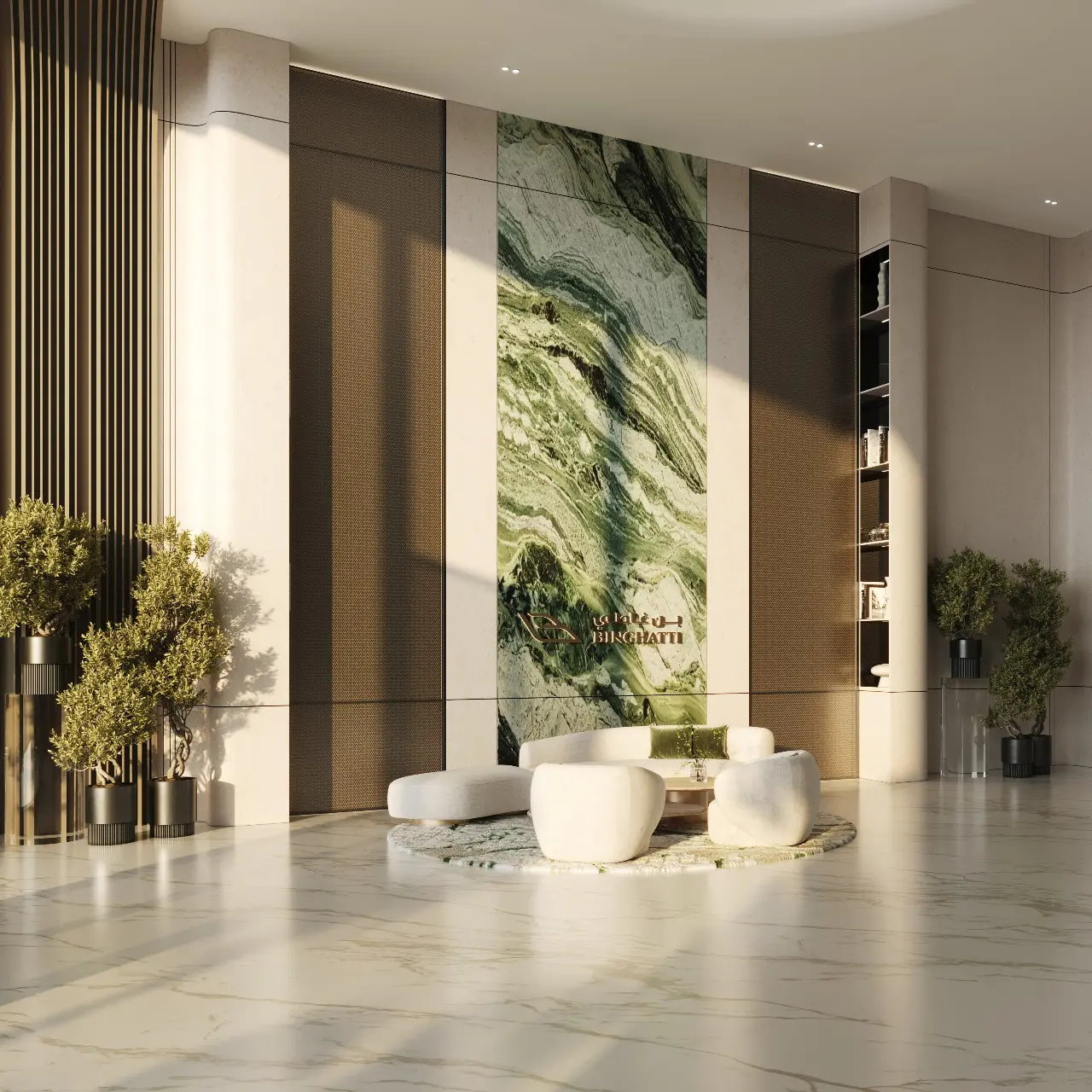 The design of Binghatti Grove incorporates Cipollino Nuvolato marble and Iris Crèma porcelain. Every detail has been meticulously crafted, with shades and textures creating a meditative atmosphere.