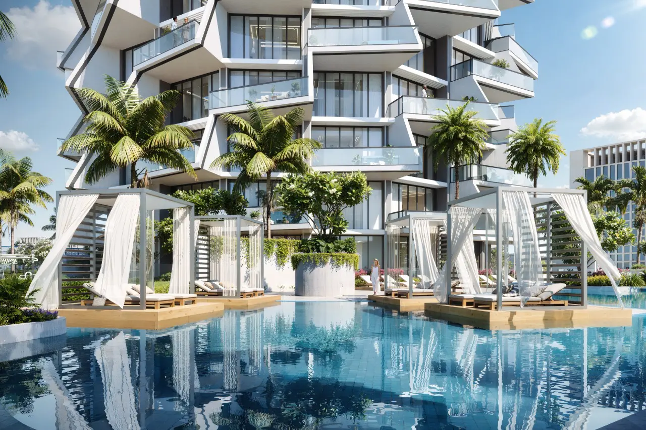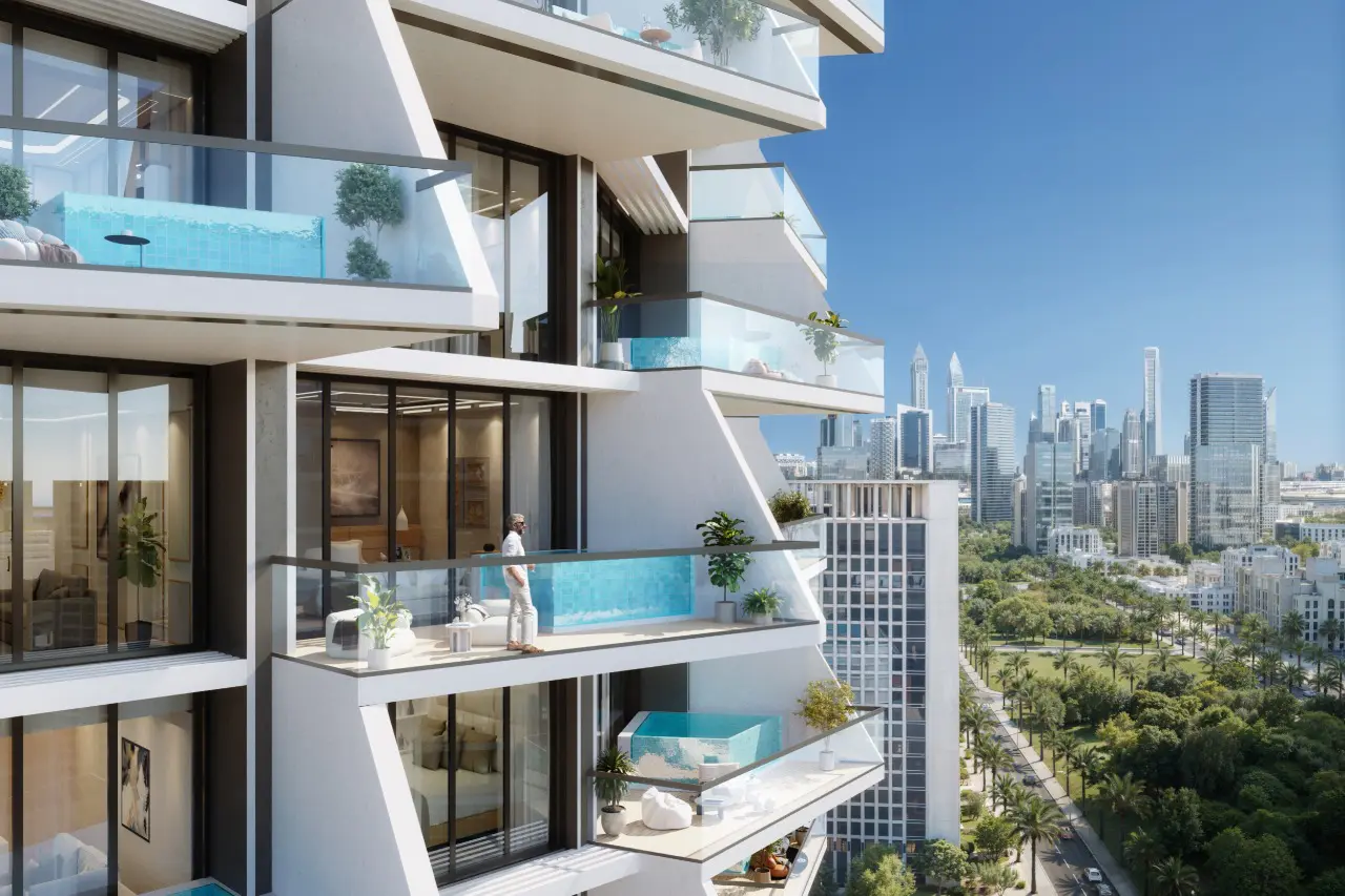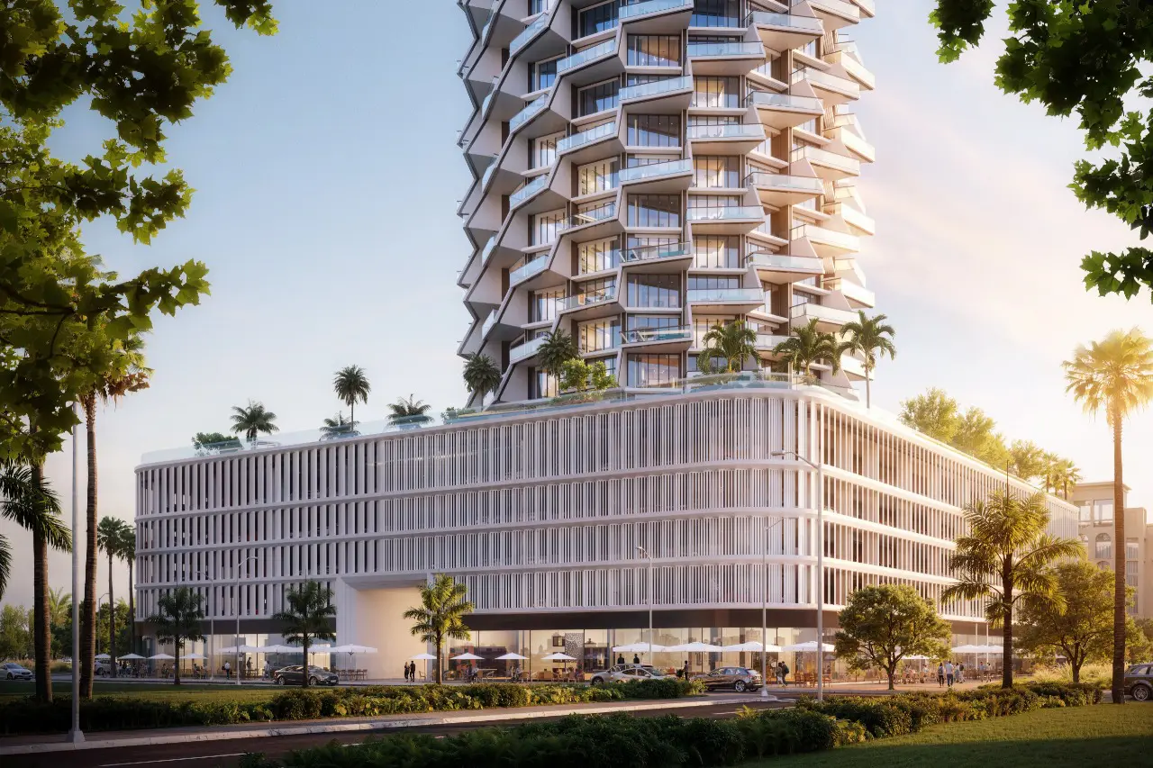 Binghatti Grove is a modern residential complex by Binghatti, located in the JVC district. The project comprises one basement floor, a ground floor, and four podium levels that house commercial spaces and parking areas. The first floor is dedicated to amenities. Above it rise forty-two residential floors with apartments featuring one to three bedrooms, private pools, and stunning views of Dubai’s iconic skyline. The nineteenth floor and the rooftop are reserved for technical facilities.