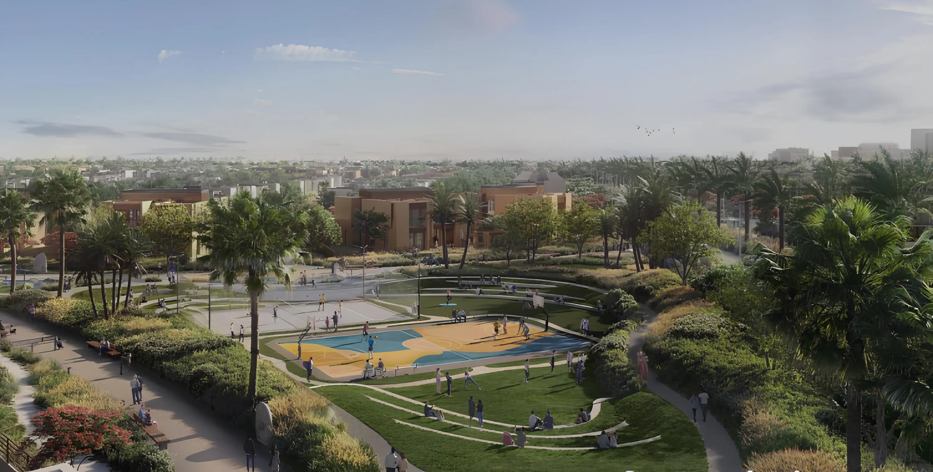 On-site infrastructure includes a shopping center, mosque, floating clubhouse, zen gardens, park, lagoon, sports grounds, and courts. For children, nurseries, a kindergarten, and a school are provided.