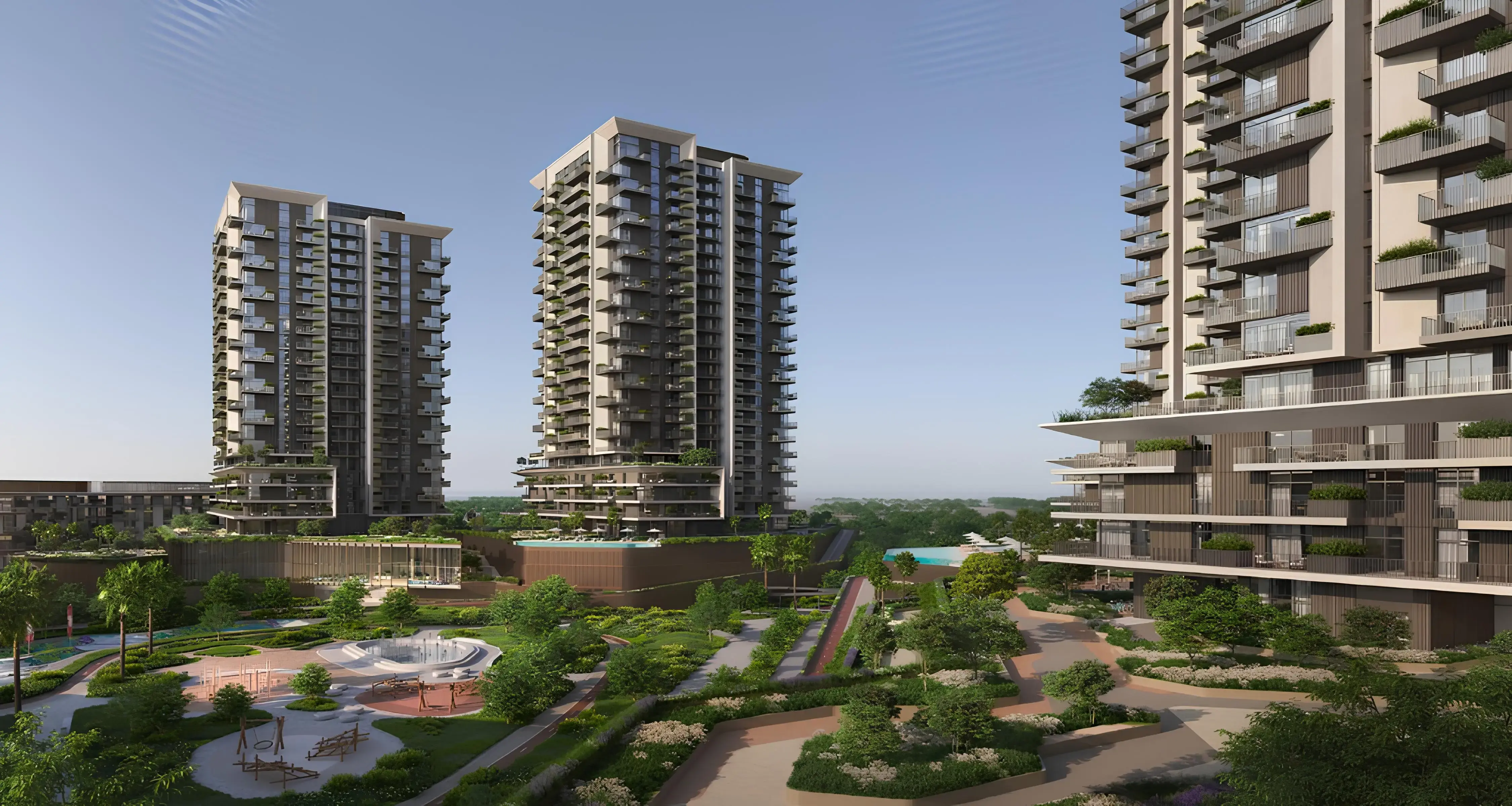 Rise by Athlon is a unique residential complex, the first apartment release in the Athlon community by Aldar. It comprises three low-rise buildings—Grid, Tempo, and Foundry—each comprising a ground floor, podium, and four residential floors, creating an intimate atmosphere. There are also five themed towers: Magenta and Neon—ground level towers with 21 residential floors; Azul—ground level towers with 27 residential floors; and Teal and Cyan—ground level towers with 24 residential floors. Together, they create a space for vertical living, embodying Athlon's philosophy of living in motion. The architectural concept combines expressive lines, natural materials, and light accents, creating a contemporary silhouette. The project offers apartments with 1, 2, and 3 bedrooms. The interior combines elegance and functionality, creating a cozy and stylish atmosphere for comfortable living. The complex's key amenities include a skate park, yoga pavilion, hammocks, an acupuncture track, a powerlifting area, horizontal bars, an obstacle course, a HIIT area, a strength and conditioning area, swimming pools, a nursery, a stretching area, a barbecue, and more. The Dubailand location provides convenient access to key points of the city: just 25 minutes from Dubai International Airport and 30 minutes from Jumeirah Beach and Burj Khalifa.