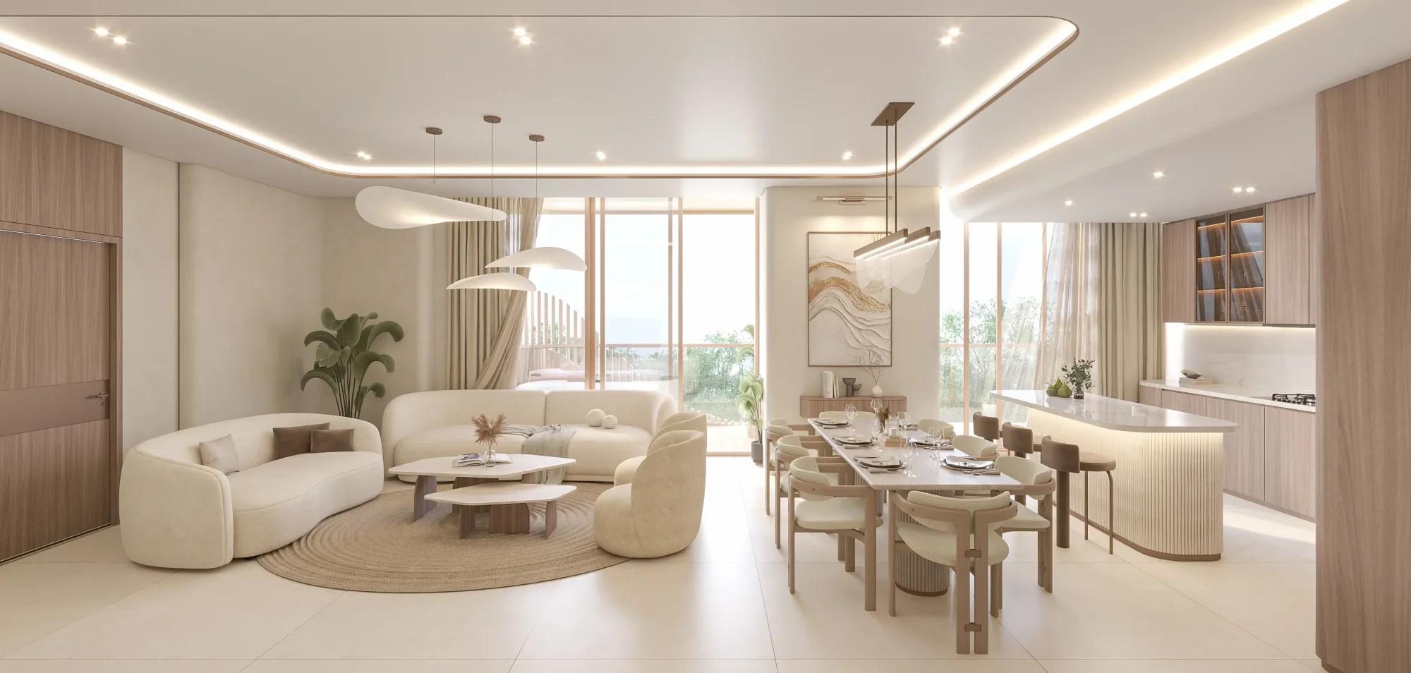 The complex offers apartments with one, two, and three bedrooms, as well as four-bedroom townhouses and penthouses. The interiors are designed in a contemporary style, focusing on space, natural light, and high-quality materials, creating a sense of comfort and elegance.