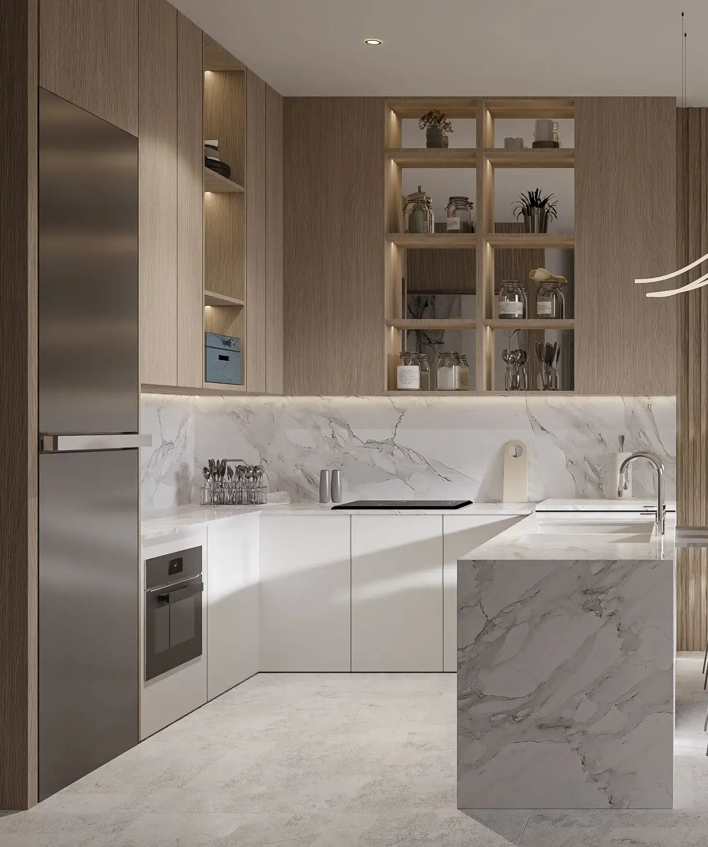 The complex includes one-, two-, and three-bedroom apartments. Layouts emphasize space and functionality: open-plan living areas, large windows, and balconies provide abundant natural light. Interiors are finished in a light neutral palette, using modern materials and minimalist design solutions.