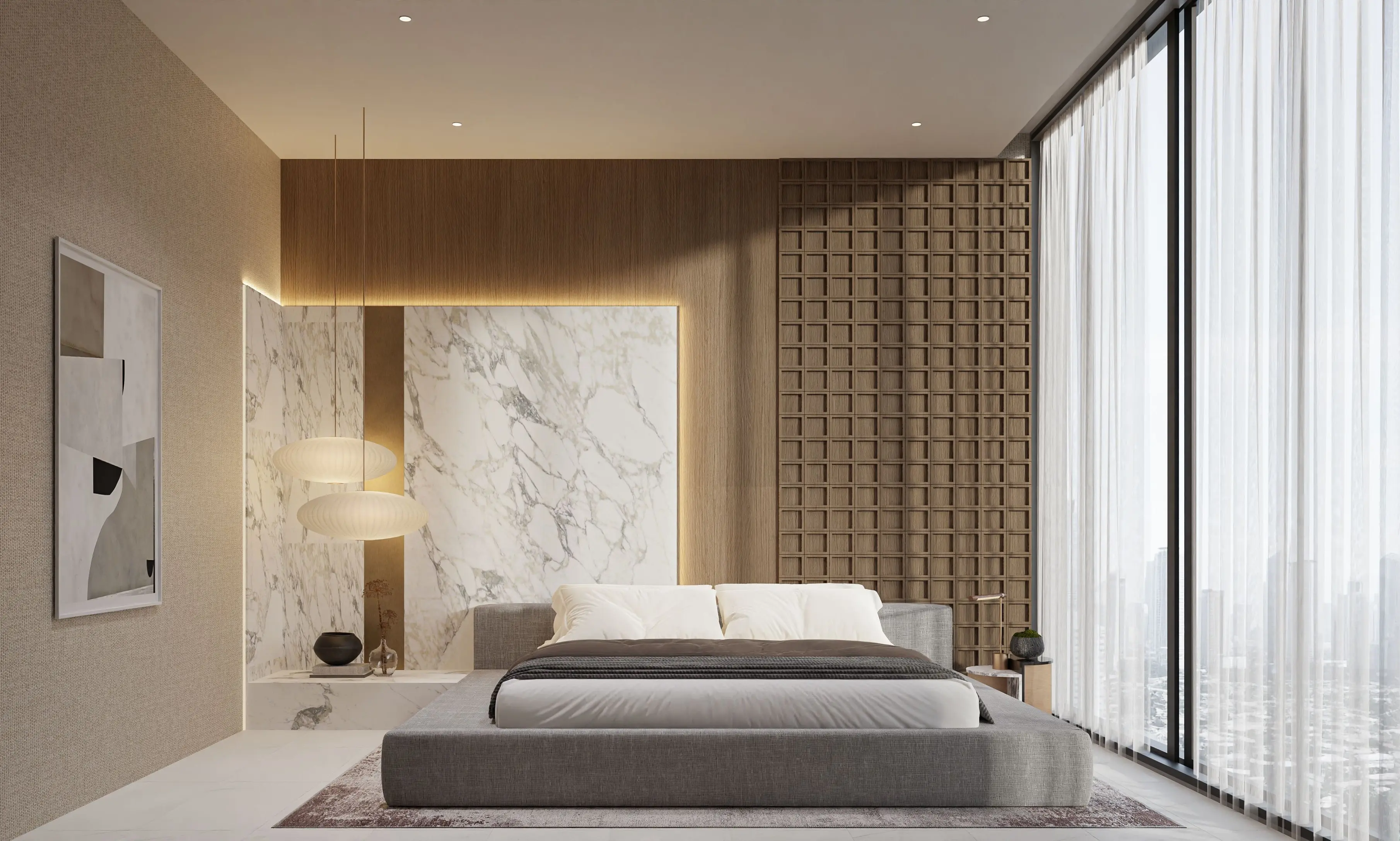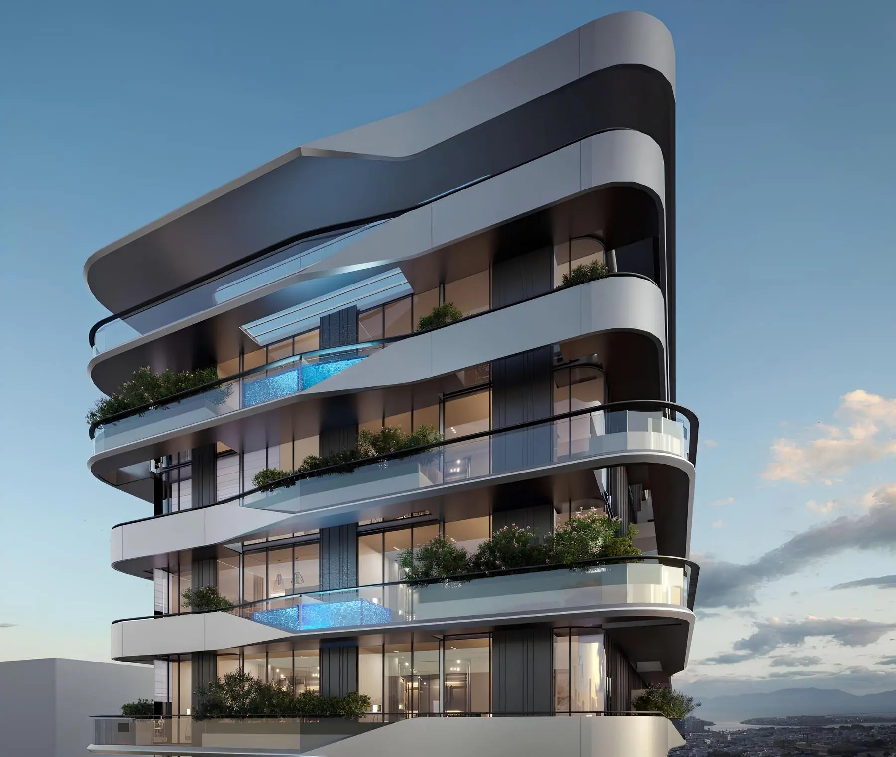 The exterior of the building is characterized by a modern and elegant design, designed taking into account the surrounding landscape, includes a ground floor, two podium levels and 12 residential floors. Architecture creates a dynamic and visually appealing structure by changing the depths of facades and balconies. The interior is finished using high-quality materials.