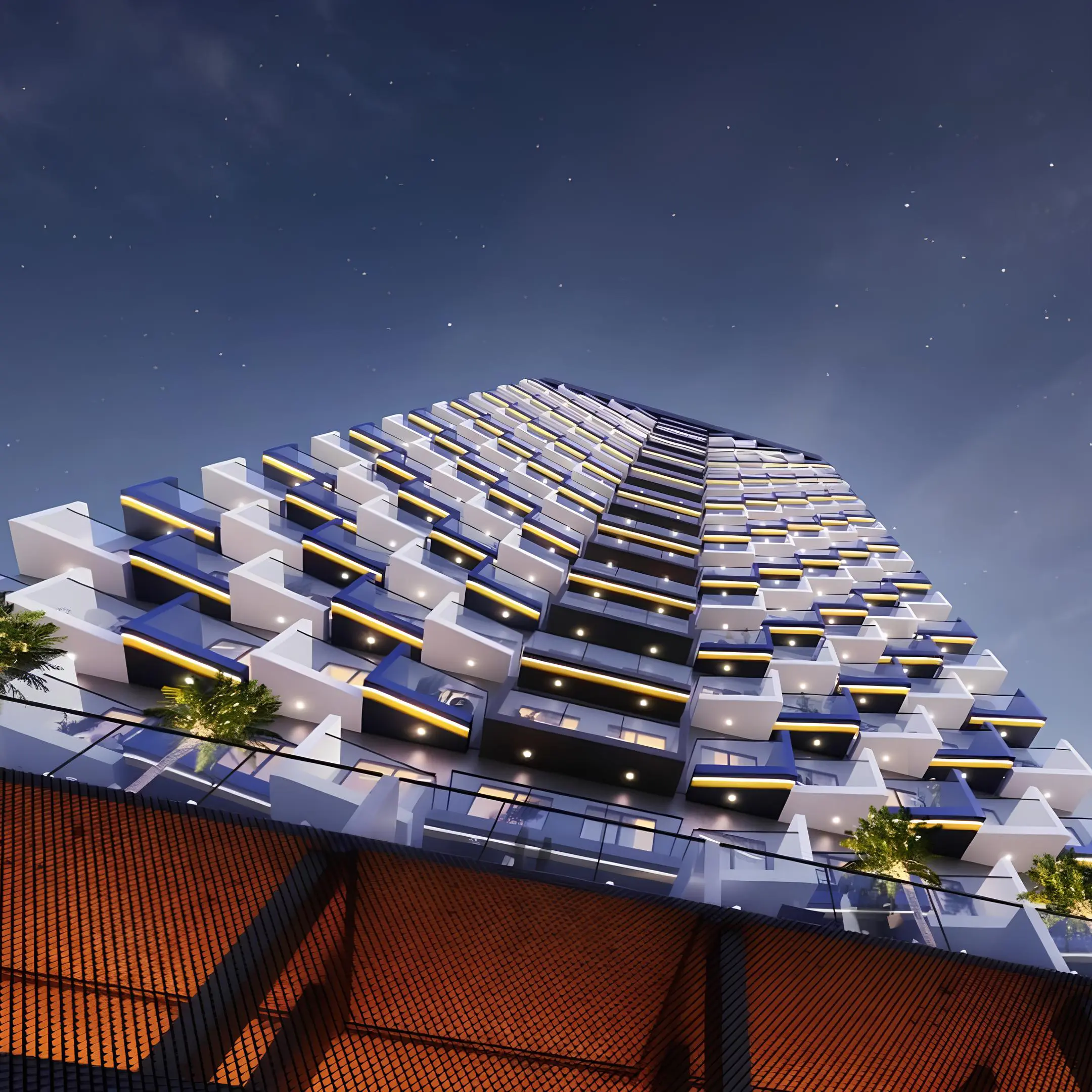 Binghatti Crest is a luxury project by Binghatti, located in the JVC neighborhood. The complex is a 24-storey tower with an amazing architecture, the main feature of which are slightly slanted intertwined balconies and original lighting.