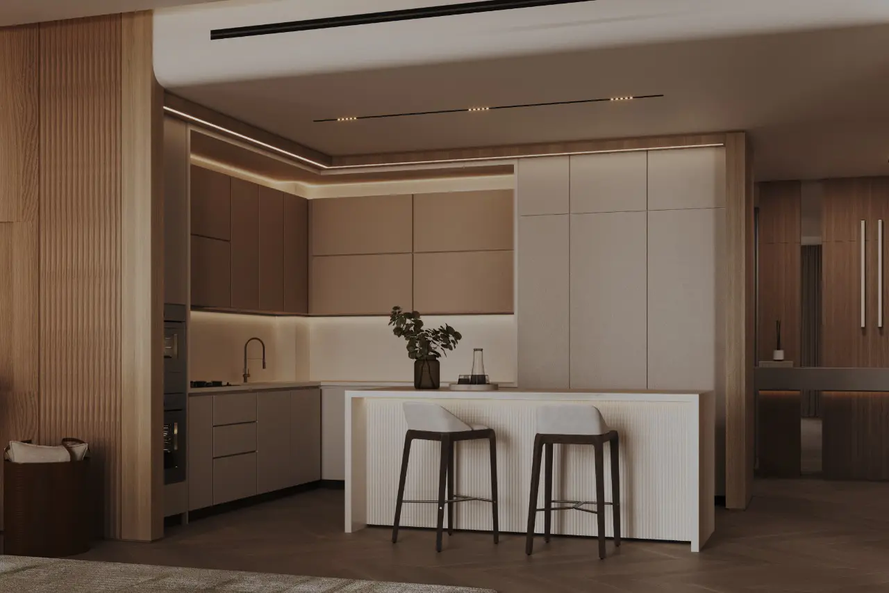 The design of Binghatti Grove incorporates Cipollino Nuvolato marble and Iris Crèma porcelain. Every detail has been meticulously crafted, with shades and textures creating a meditative atmosphere.