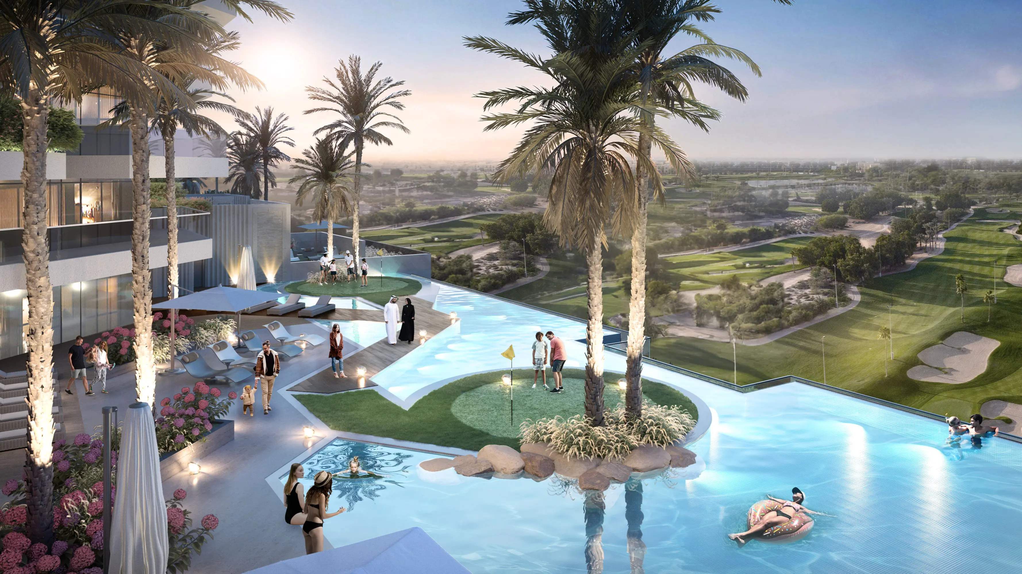 Golf Greens 1 is the first phase of a luxury project by developer Damac, located in the Damac Hills community. The building consists of a ground level, three podium floors, 31 residential floors, and a rooftop. The collection includes one- and two-bedroom apartments, as well as two- and three-bedroom townhouses. The architecture features a contemporary style with a focus on panoramic views: residents can enjoy balconies and terraces with direct views of the golf course. The complex blends seamlessly into the green surroundings, emphasizing harmony with nature. Spacious residential floors are complemented by exclusive leisure and recreation areas. Interiors are designed with light tones, high-quality materials, and functional layouts. The overall design combines a natural theme with the comfort of urban living. Residents have access to swimming pools with islands, waterfront lounge areas, a palm garden, a golf simulator and academy, night golf, creative zones with 3D printing, balcony golf experiences, golf carts, ergonomic relaxation zones, and sky golf-style activity spaces. The complex is located in Damac Hills with direct access to the golf course and quick connections to key city destinations. Within 10–15 minutes’ drive are Dubai Polo & Equestrian Club, Dubai Autodrome, Miracle Garden, Dubai International Stadium, Global Village, IMG World, and Hamdan Sports Complex.