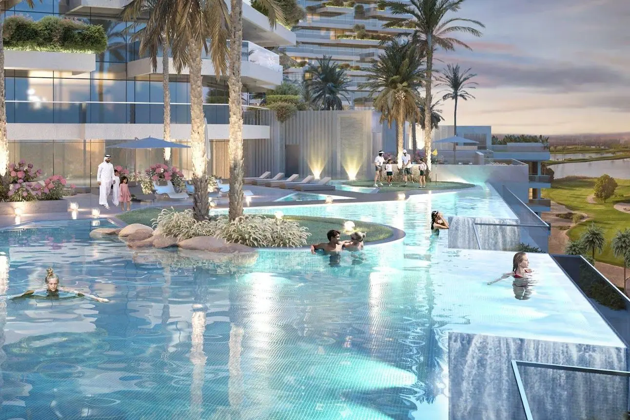 Golf Greens 2B is the second tower of the second building within the Golf Greens residential complex in Damac Hills, featuring a ground level, three podium floors, 31 residential floors, and a rooftop. The project offers one- and two-bedroom apartments, as well as two- and three-bedroom townhouses. The architecture embraces a clean, contemporary style with an emphasis on natural tones and open lines. Interiors are designed in a warm, minimalist palette with earthy hues and natural materials, creating an atmosphere of comfort and tranquility. Panoramic windows and balconies fill the spaces with light and offer views of the golf courses and lush green landscapes. Townhouse owners can enjoy private gardens with cozy lounge areas for relaxation. Residents of Golf Greens 2B have access to a variety of amenities, including aqua gardens, infinity pools, modern gyms, indoor golf simulators, oversized swings, and the convenience of golf cart transportation throughout the community — all contributing to a resort-like lifestyle. The location provides easy access to key destinations across the city: 22 minutes to Palm Jumeirah, 24 minutes to Dubai Harbour, 26 minutes to Downtown Dubai and DIFC, and around 30 minutes to Burj Khalifa. Both Dubai International and Al Maktoum airports are approximately 22 minutes away.