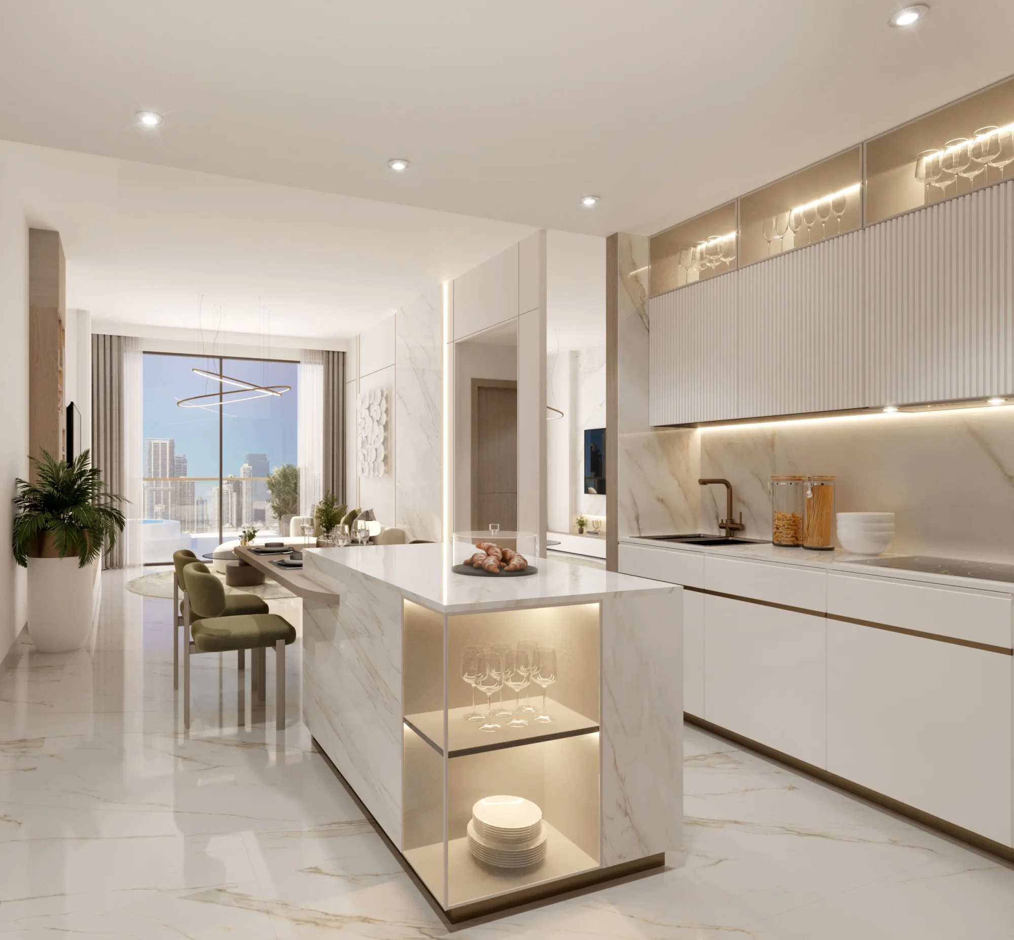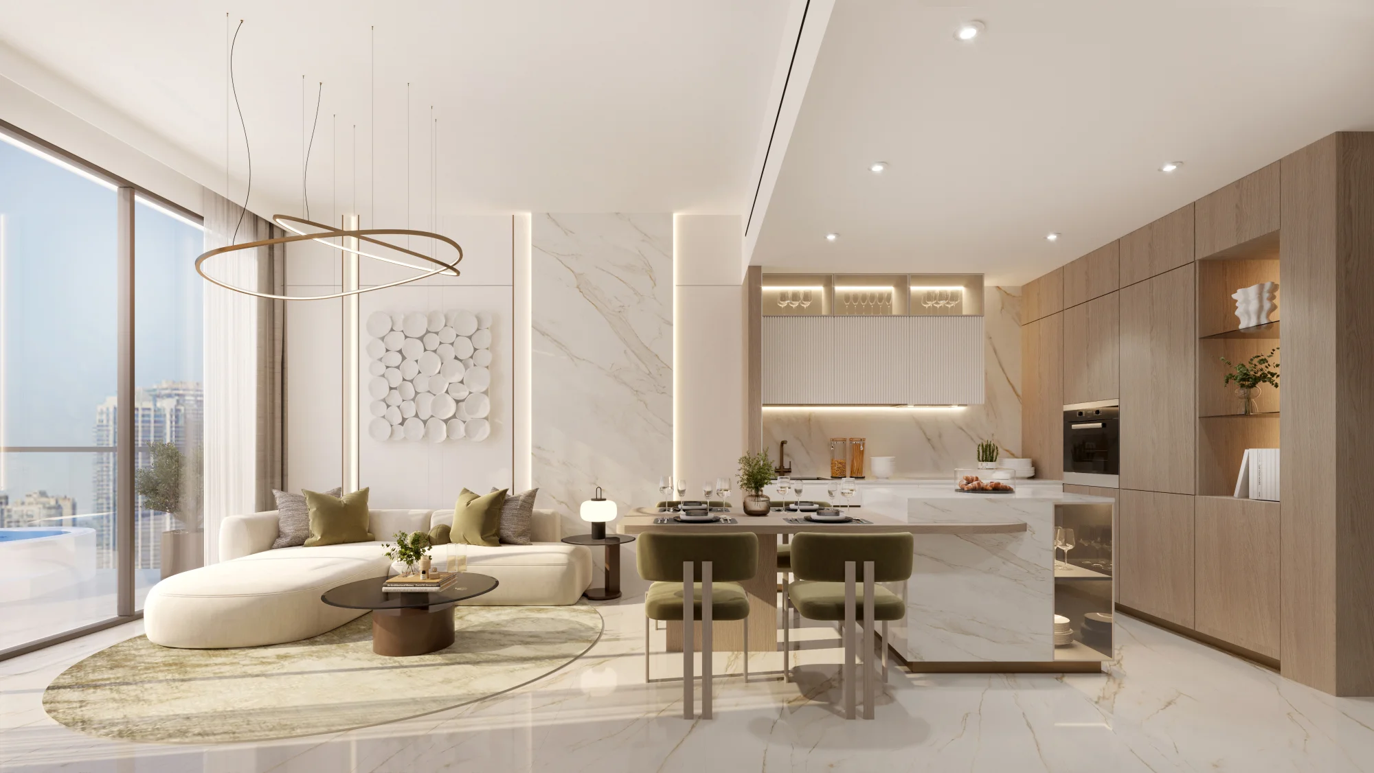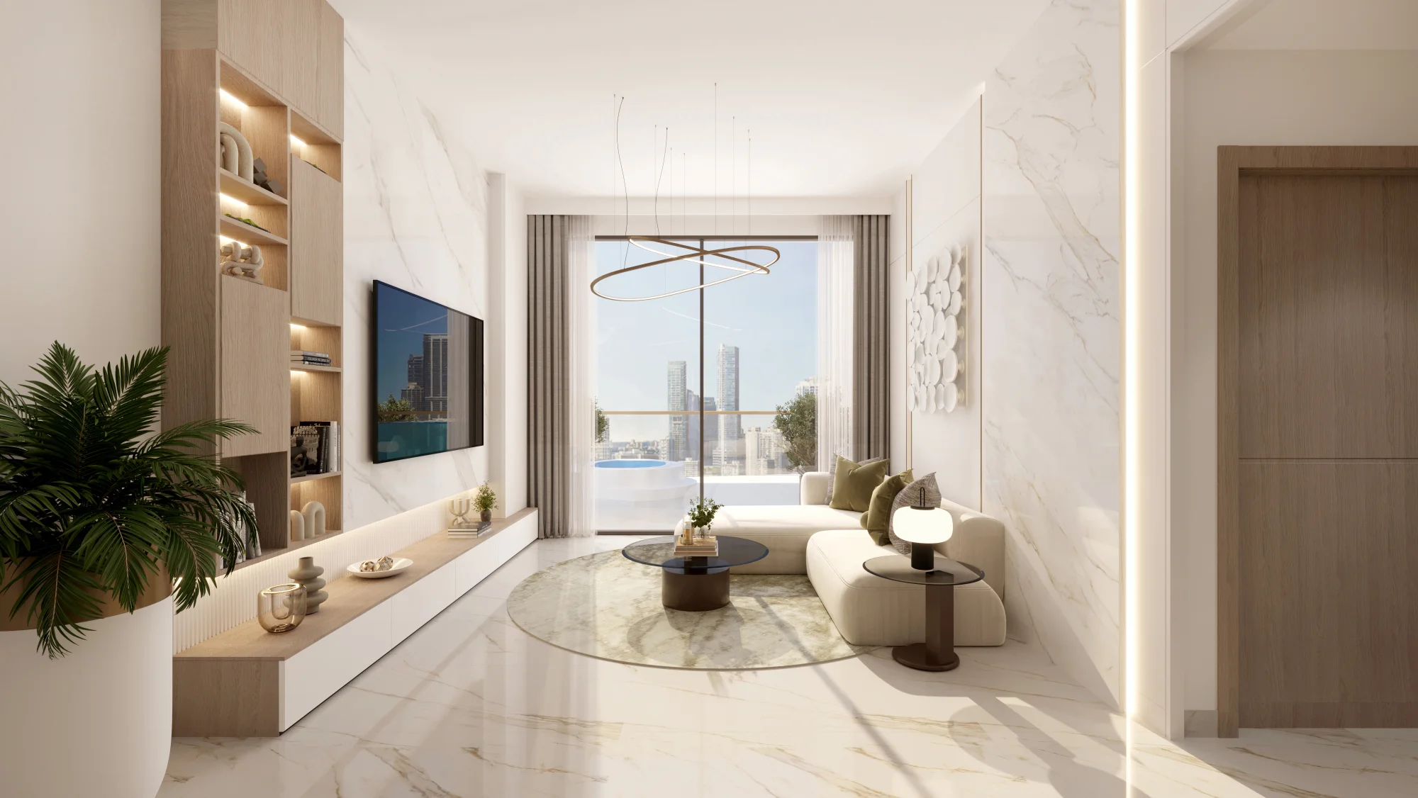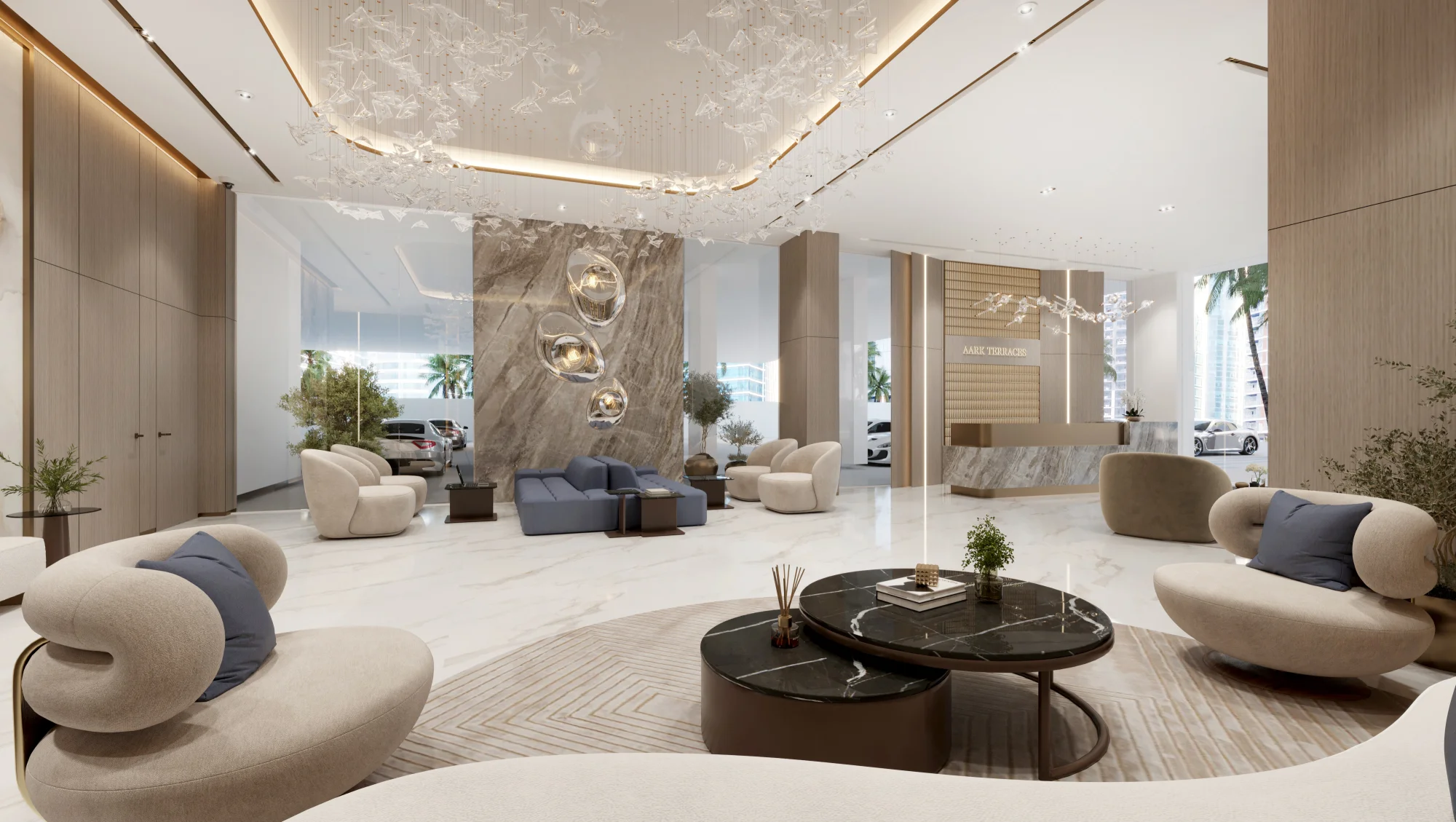 Spacious apartments at Aark Terraces are available in one- and two-bedroom options, including exclusive residences with private Jacuzzis. The interiors feature thoughtful design and premium finishes and are equipped with premium brand appliances. Special attention to detail is paid, from exquisite floor coverings to ergonomic layout solutions.