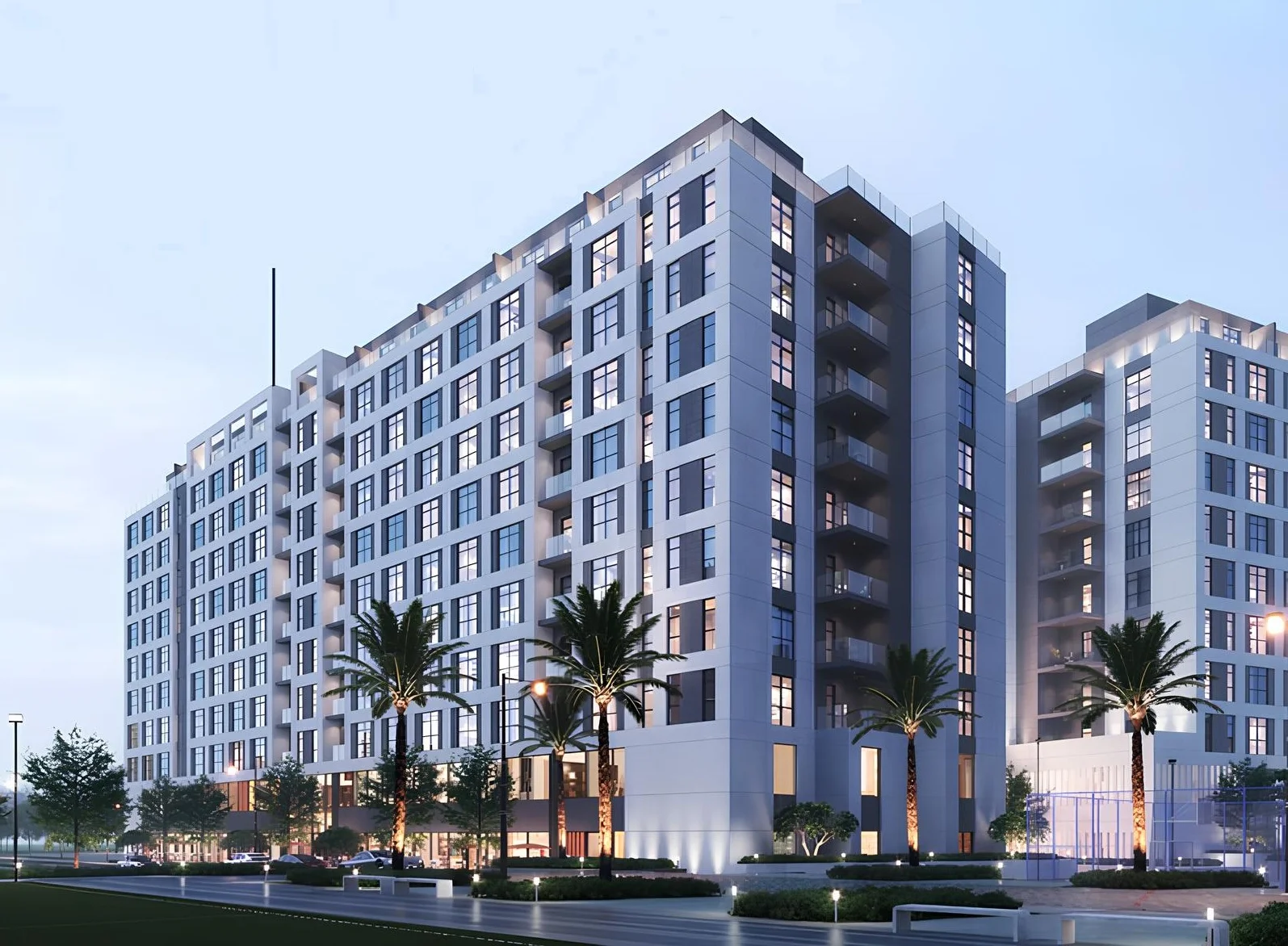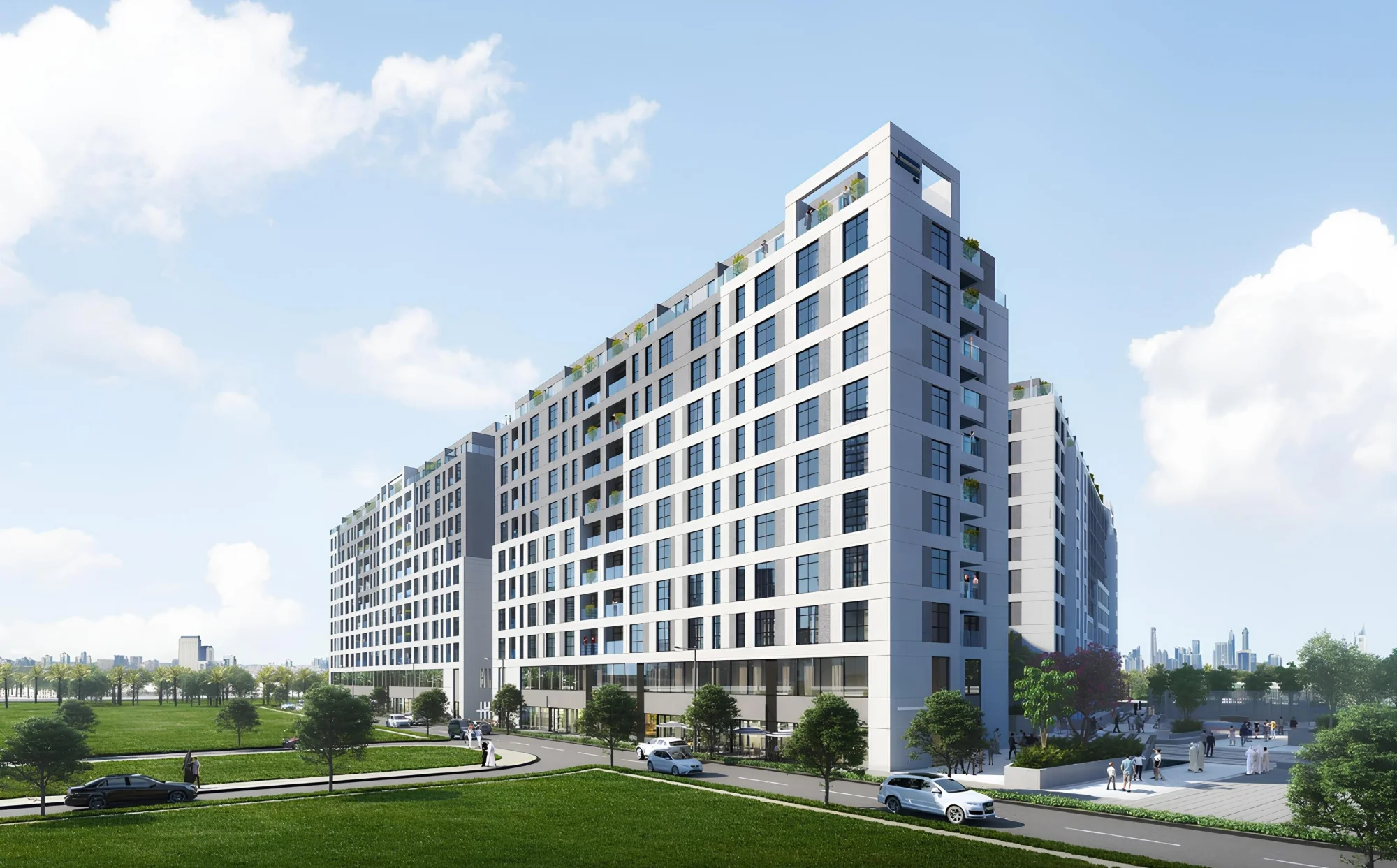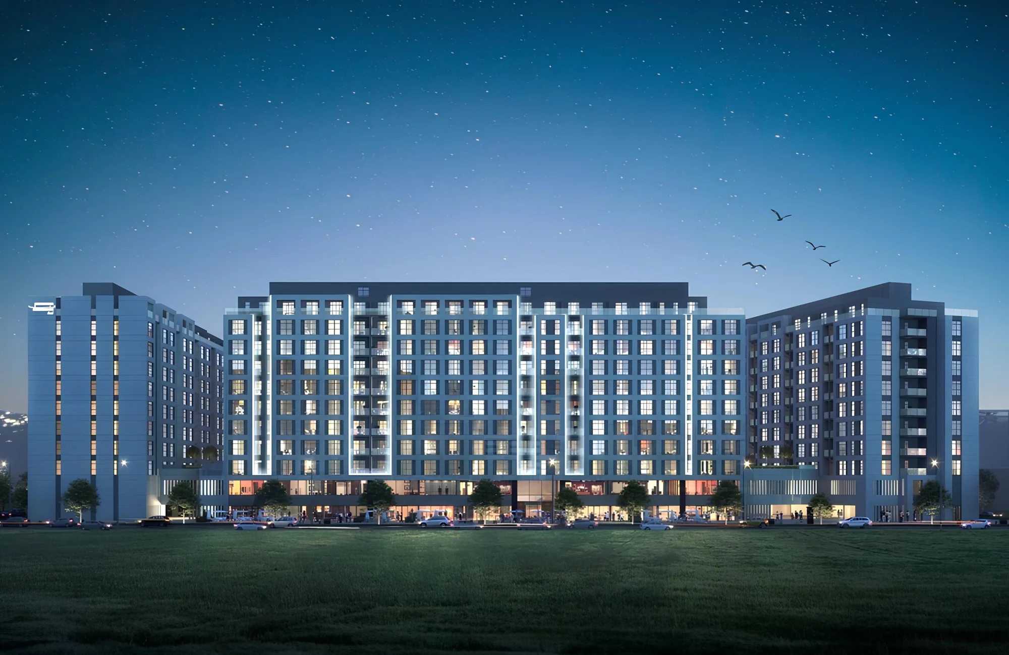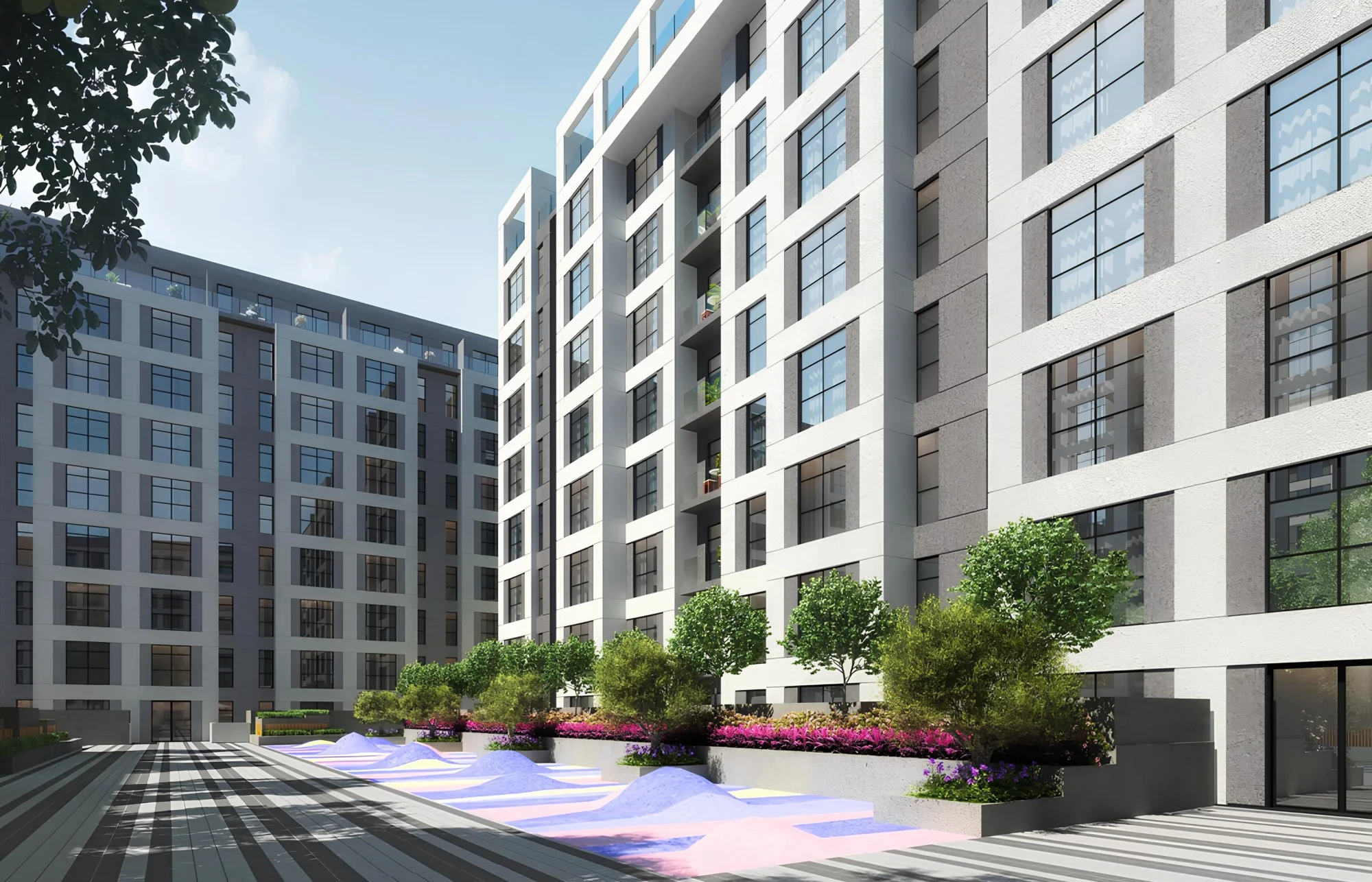 The project consists of a complex of 10 buildings, including a ground floor and 9 residential floors, with studios and apartments with 1-3 bedrooms. The exterior of the buildings is characterized by a modern and elegant design that harmoniously fits into the surrounding landscape. The facades of the buildings are decorated in bright colors, creating a feeling of lightness and spaciousness. A landscaped area with greenery and recreation areas complements the overall picture. The interiors of the apartments are made using high-quality materials and modern design solutions. The thoughtful layout allows for the most efficient use of space. Large windows provide good natural light.