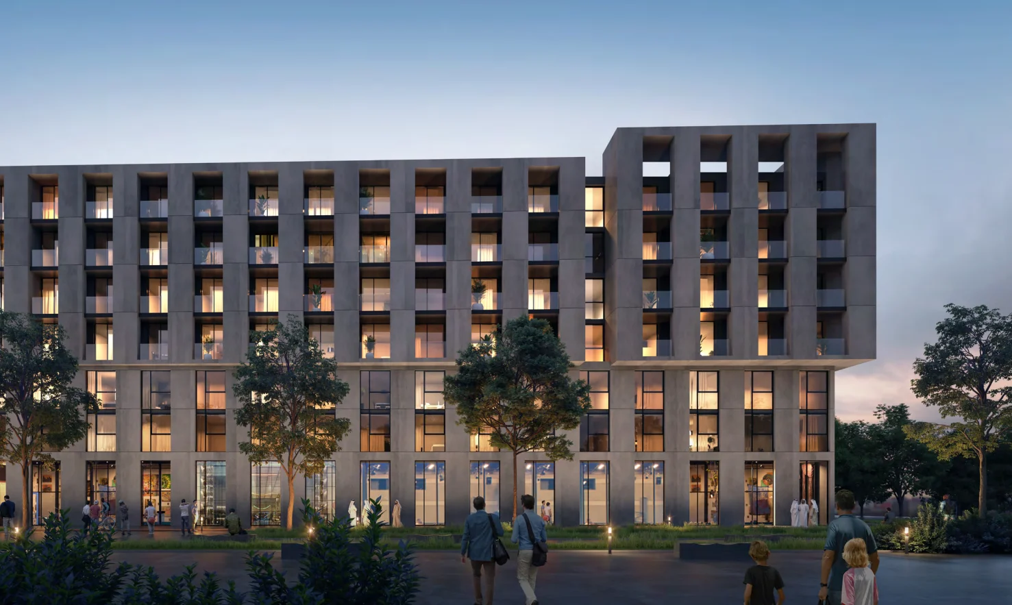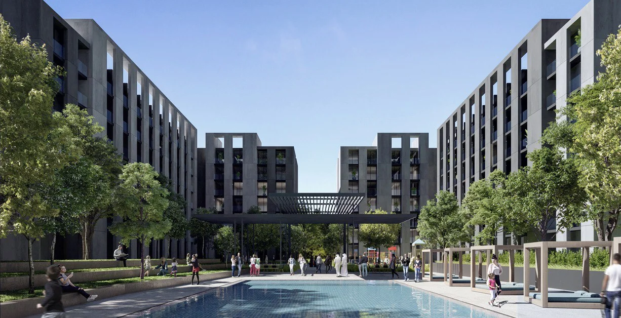 Residents of Aljada Tiraz can enjoy a variety of amenities including a smart home system, 24-hour security, covered parking, a children's playground, and a gym. The courtyard of the residential complex features a landscaped recreational area with a swimming pool.