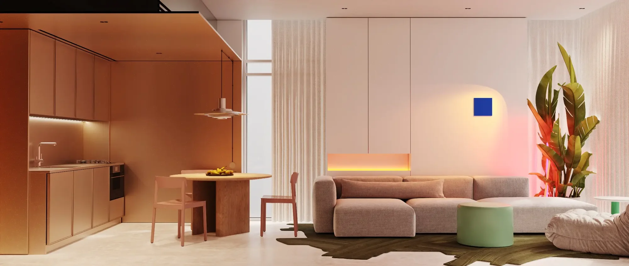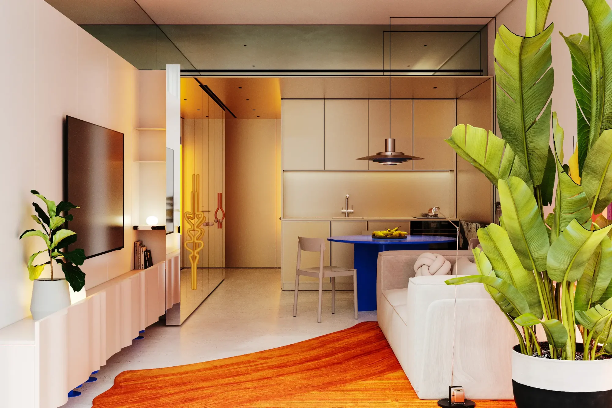 VIBE offers studios and one-bedroom apartments. The interiors convey an atmosphere of creative expression: rich tones, contrasting textures and thoughtful lighting form an impressive space filled with warmth and personality.