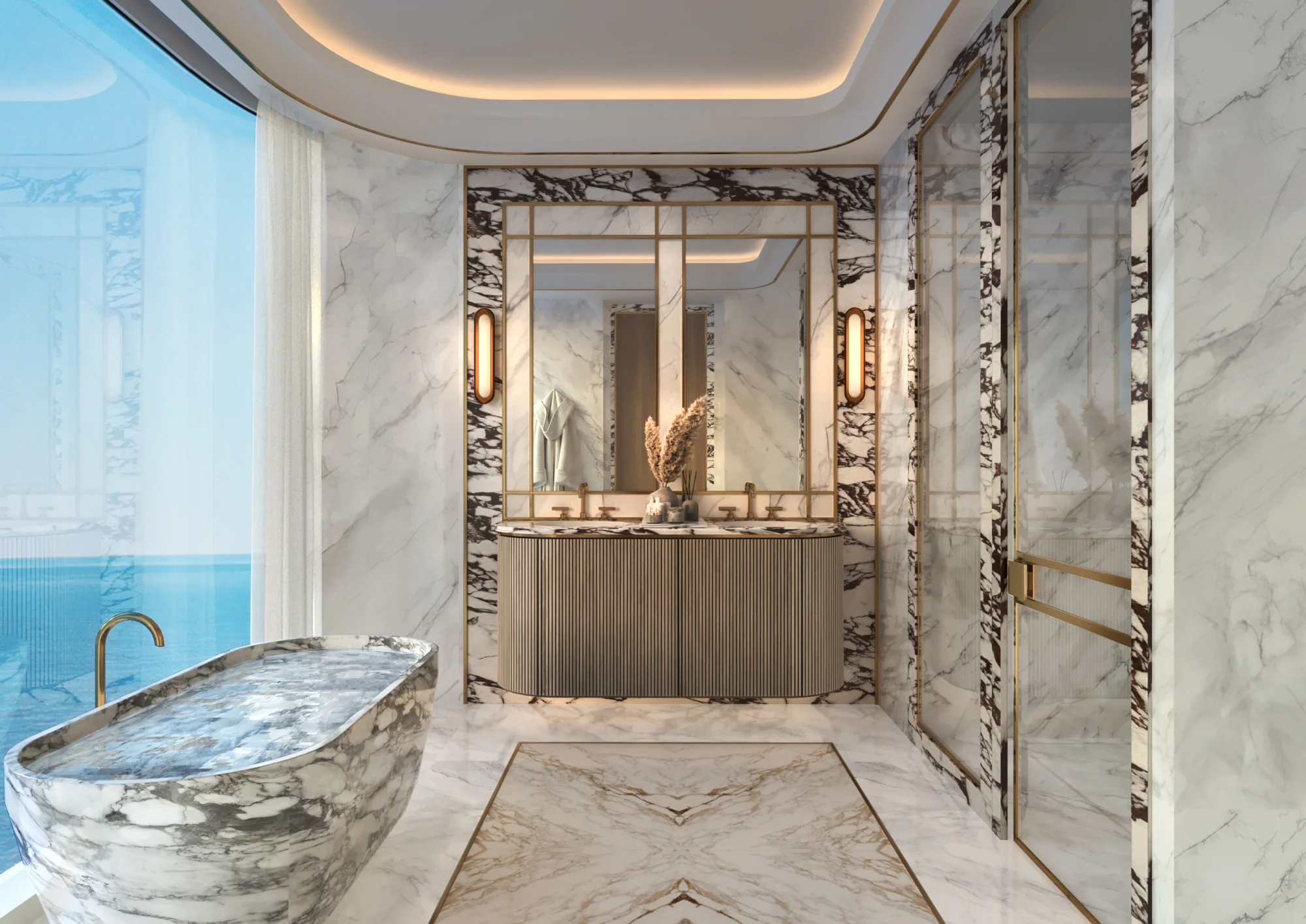 The interiors and halls of the complex were created in collaboration with the luxury Italian furniture brand Fendi Casa. Premium world-class amenities are provided for the residents of One Crescent, including a communal area with a swimming pool, a gym with high-end equipment, a cinema, a spa center, concierge services and a personal driver.