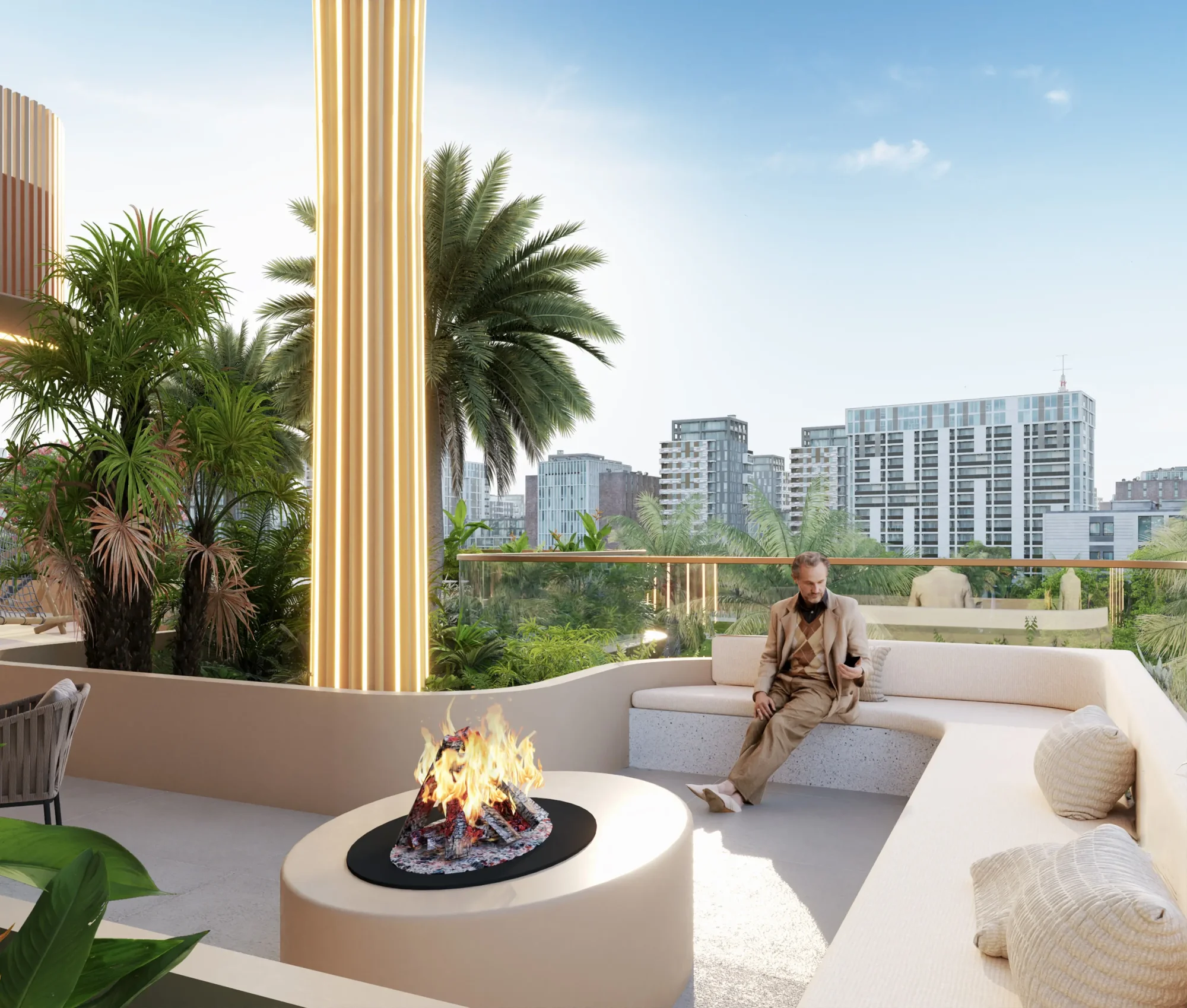 The complex provides residents with a variety of amenities: swimming pools, BBQ area, indoor and outdoor gyms, kids' play area, amphitheater, outdoor cinema, rooftop gardens, lounge area, jacuzzi, poolside bar, and a yoga and aerobics area.