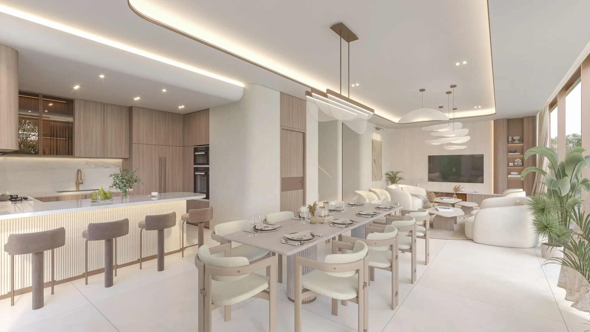The complex offers apartments with one, two, and three bedrooms, as well as four-bedroom townhouses and penthouses. The interiors are designed in a contemporary style, focusing on space, natural light, and high-quality materials, creating a sense of comfort and elegance.